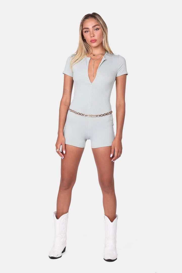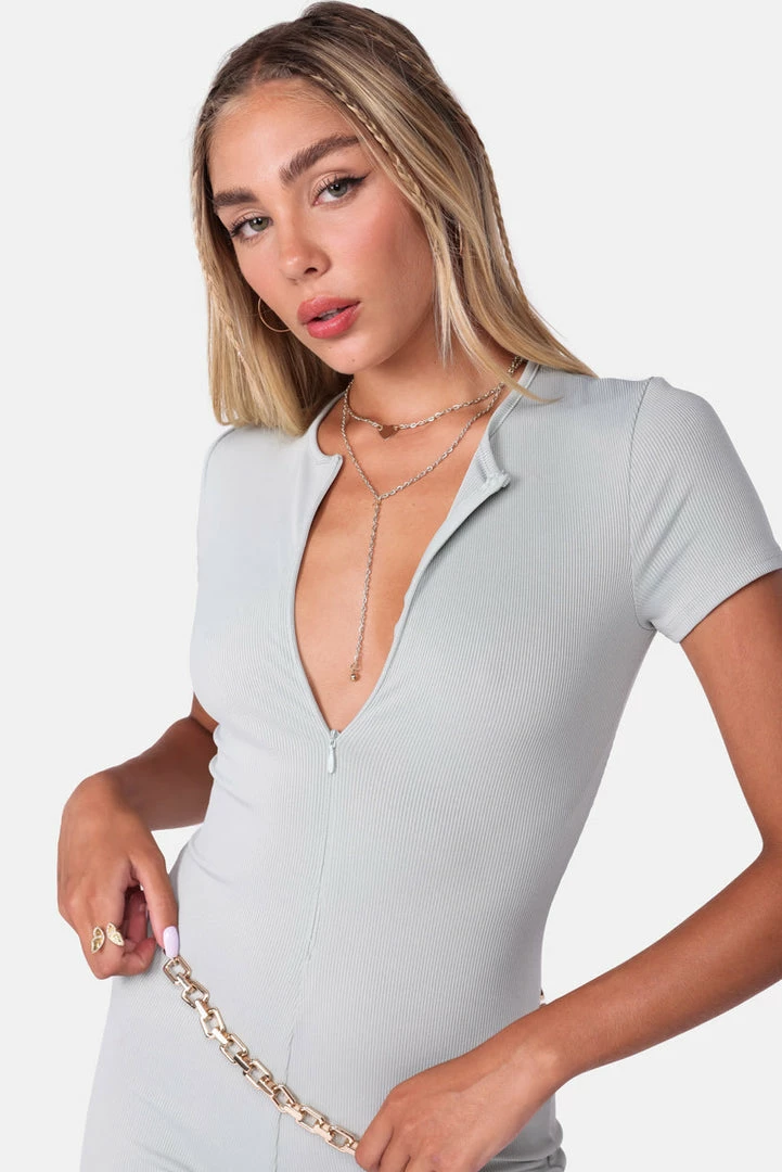 - Take it from day to night. Playsuit in stylish rib with front zip closure, round neckline and short sleeves.