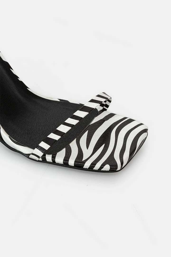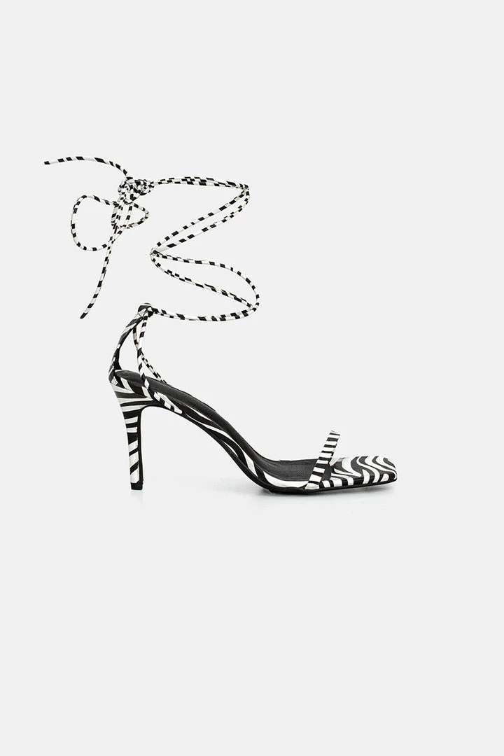- Fancy dinner ready. Faux leather sandals with a thin strap in the square toe, cheeky stiletto heel and long, ankle tie traps.