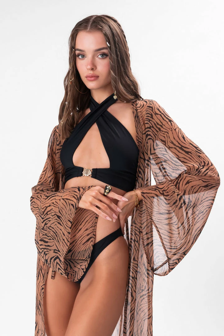 - On beach time. Sheer maxi kimono in all-over tiger print featuring front tie closure, long sleeves and slit hem.