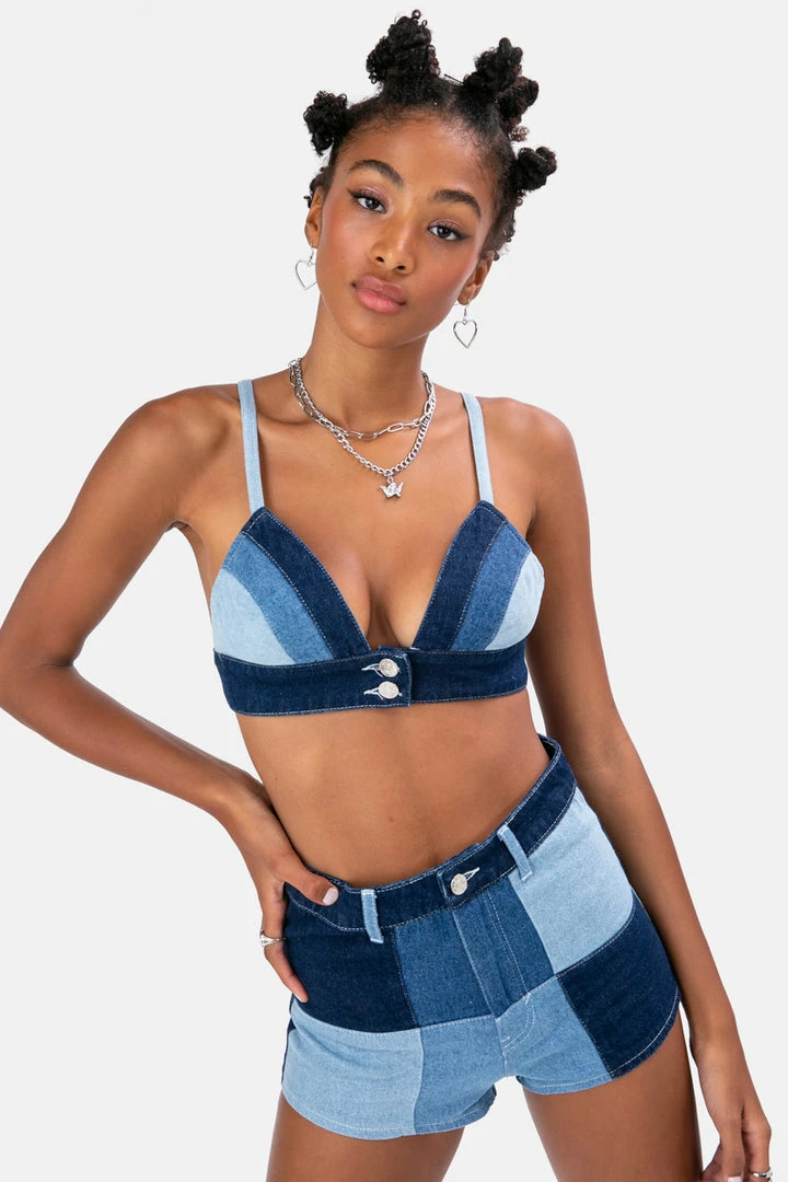 - Denim heaven, RH! Patchwork denim bralette with adjustable spaghetti straps, button closure in the front and elastic hem for extra comfort. Life is short, get this!