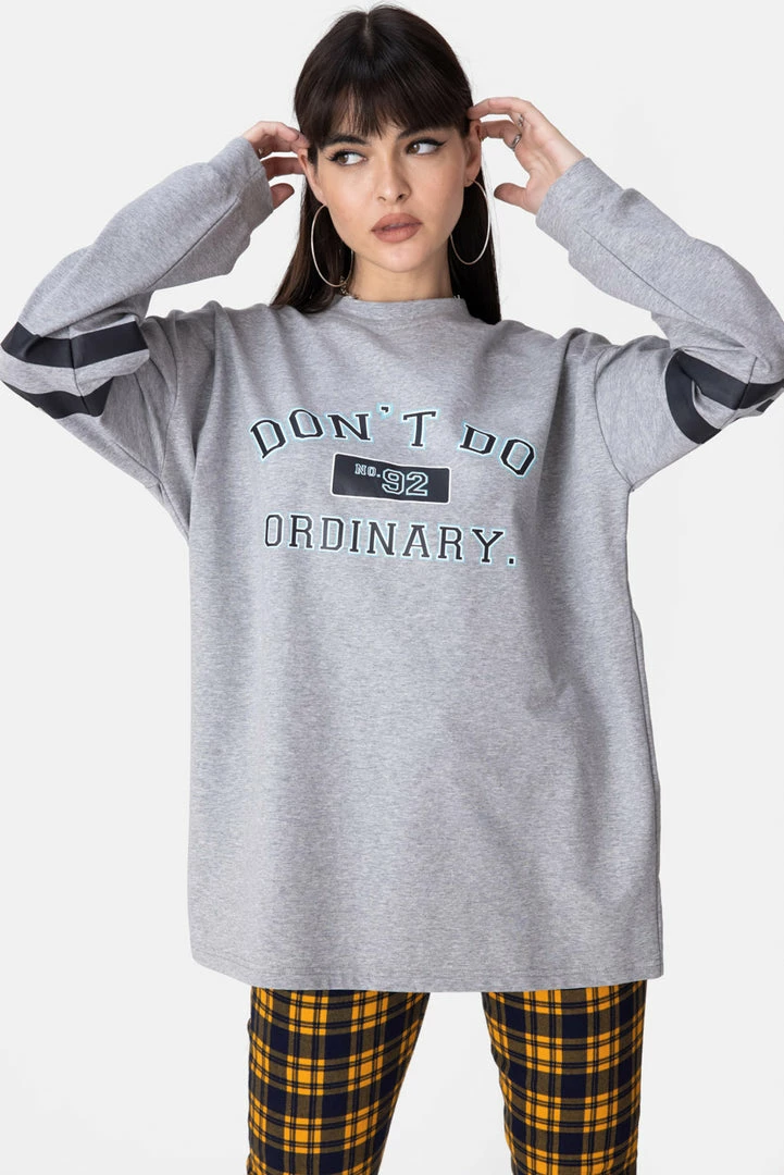- Anything but ordinary. Oversize long sleeved t-shirt with graphic print on both the front and sleeves, crewneck and fitted cuffs.