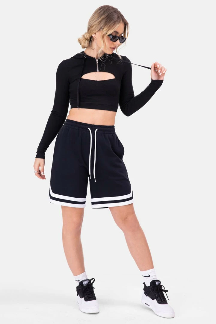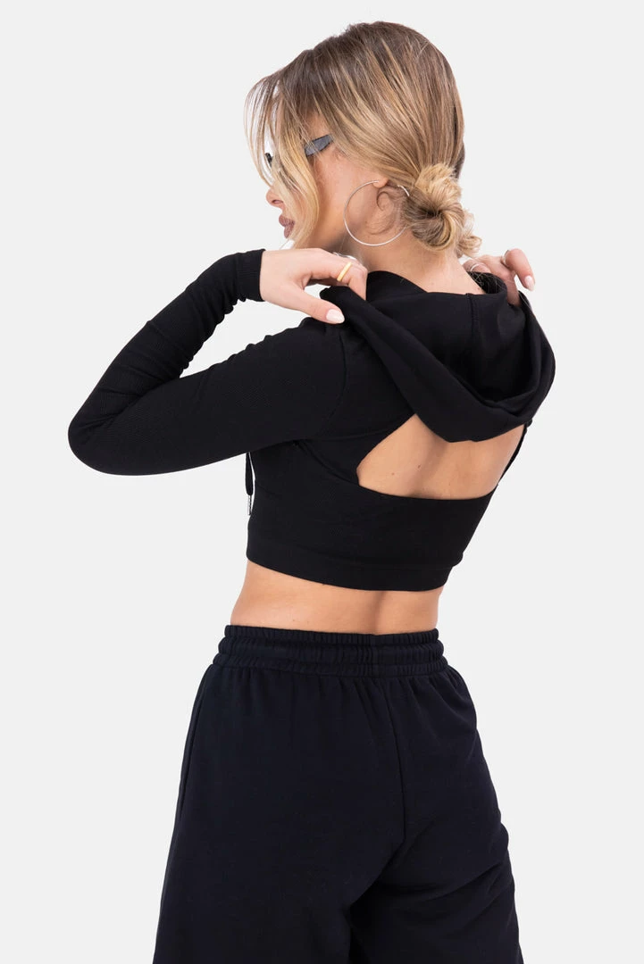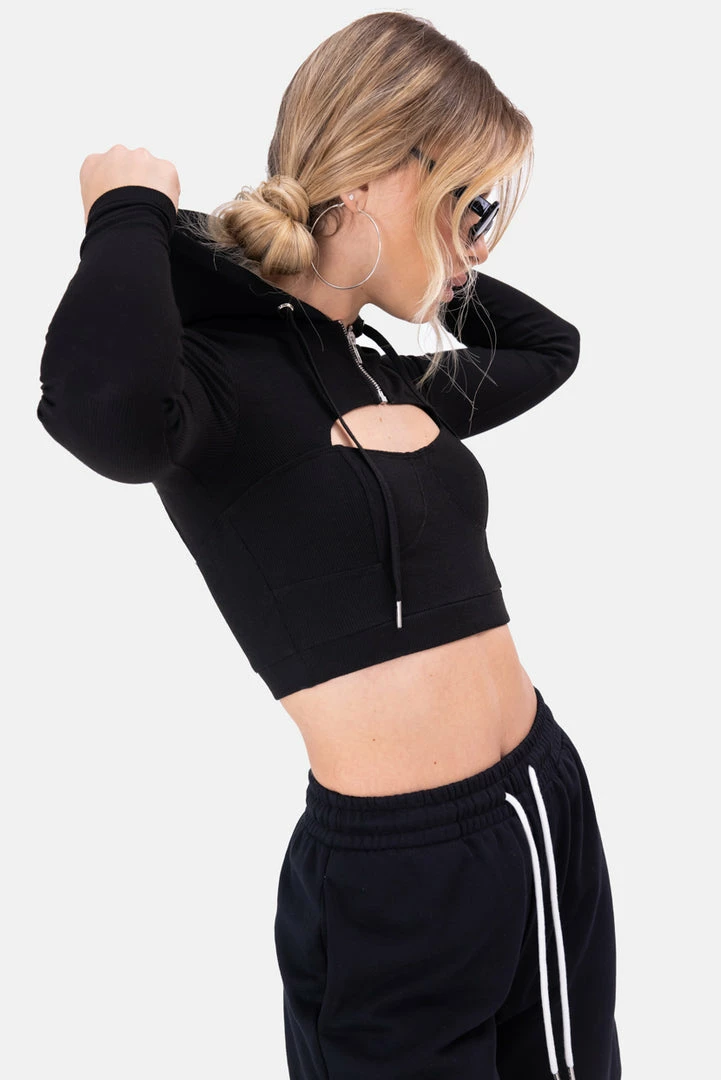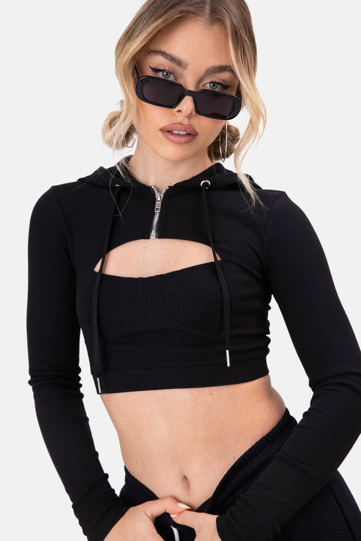 - It’s a piece of work. Fine ribbed crop top featuring a drawstring hood, front zip detail, cut-out in the front and back, long sleeves and cup detail.