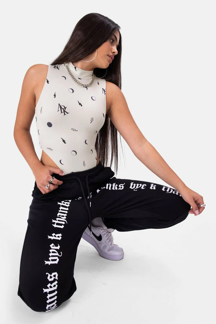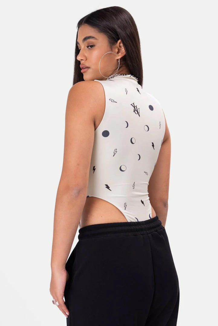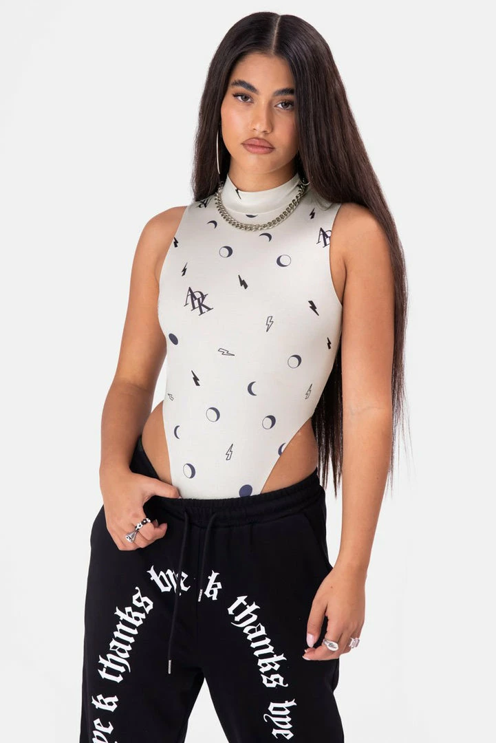 - Go out on a high note. Sleeveless stretchy bodysuit with ADK print all-over, super high-leg design, high neck and a hidden snap button closure