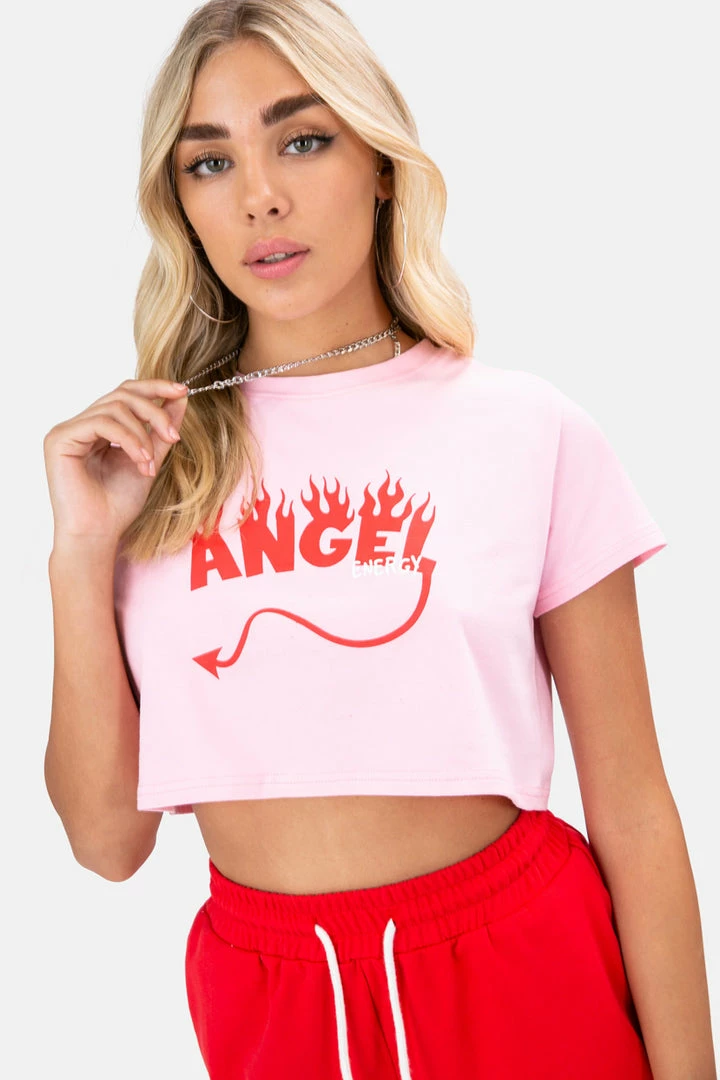 - K, we get it, you’re a good girl but no angel. Cropped t-shirt with sassy printed text in the front, round neck and short sleeves.