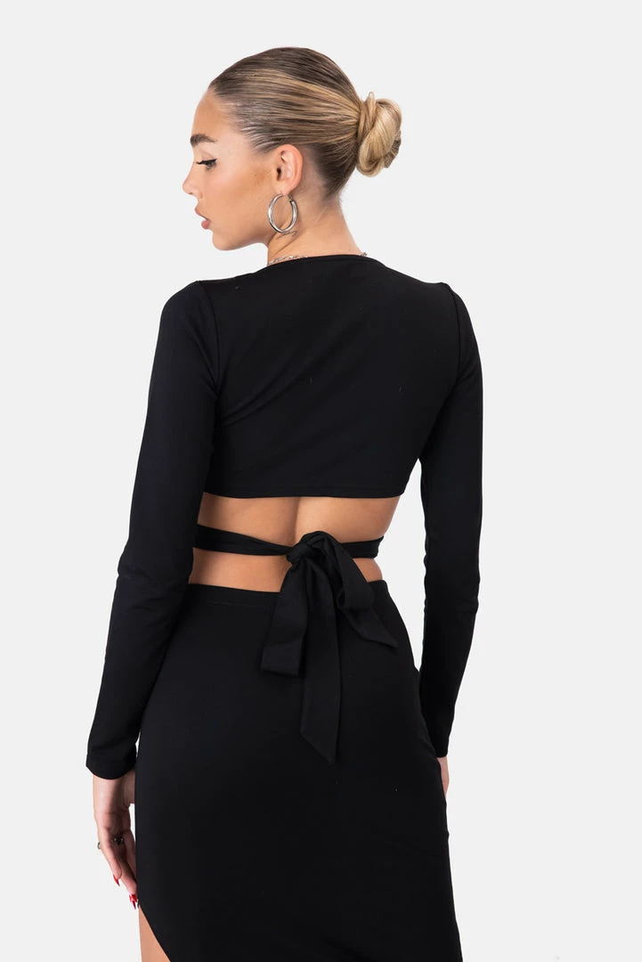 - Tonight it’s party time. Mega-cropped top featuring long sleeves, deep V-neck and metal ring detail with wide tie strings.