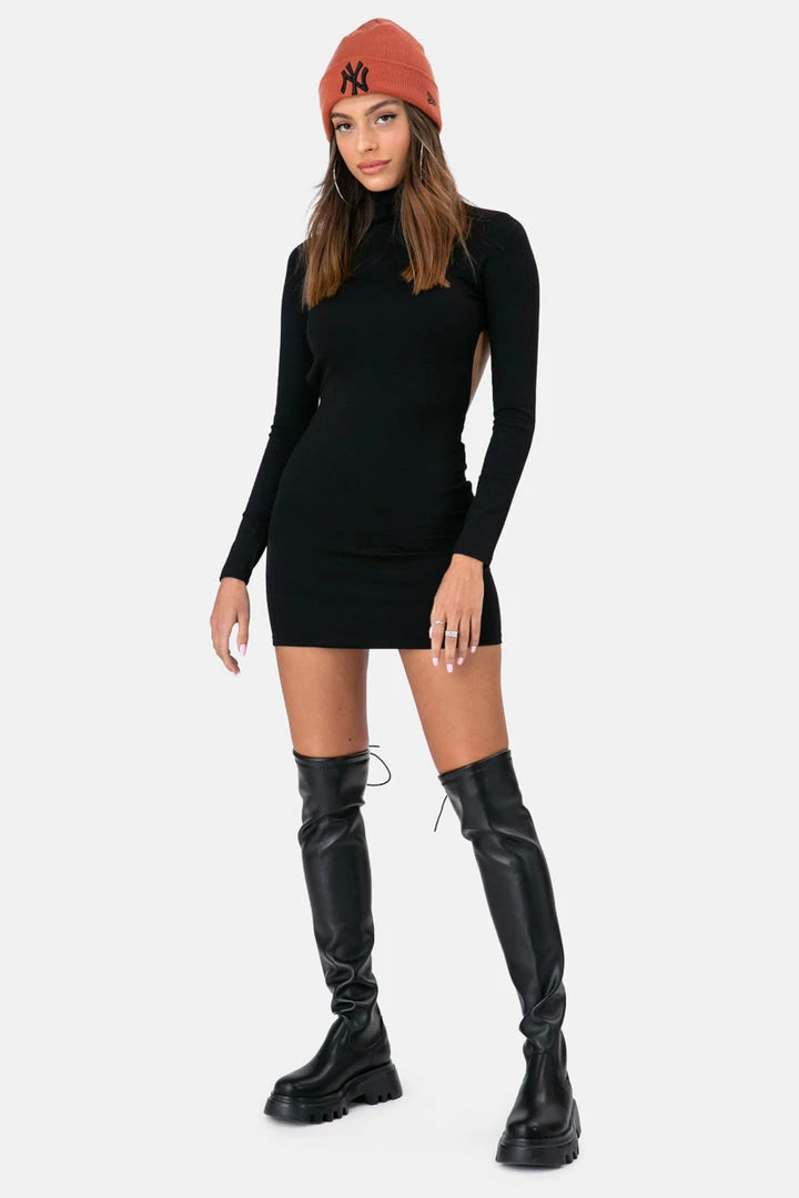 - Hot sauce, rh. Stretchy mini dress with turtleneck, long sleeves and an open back in just the right shape. Serve it up.