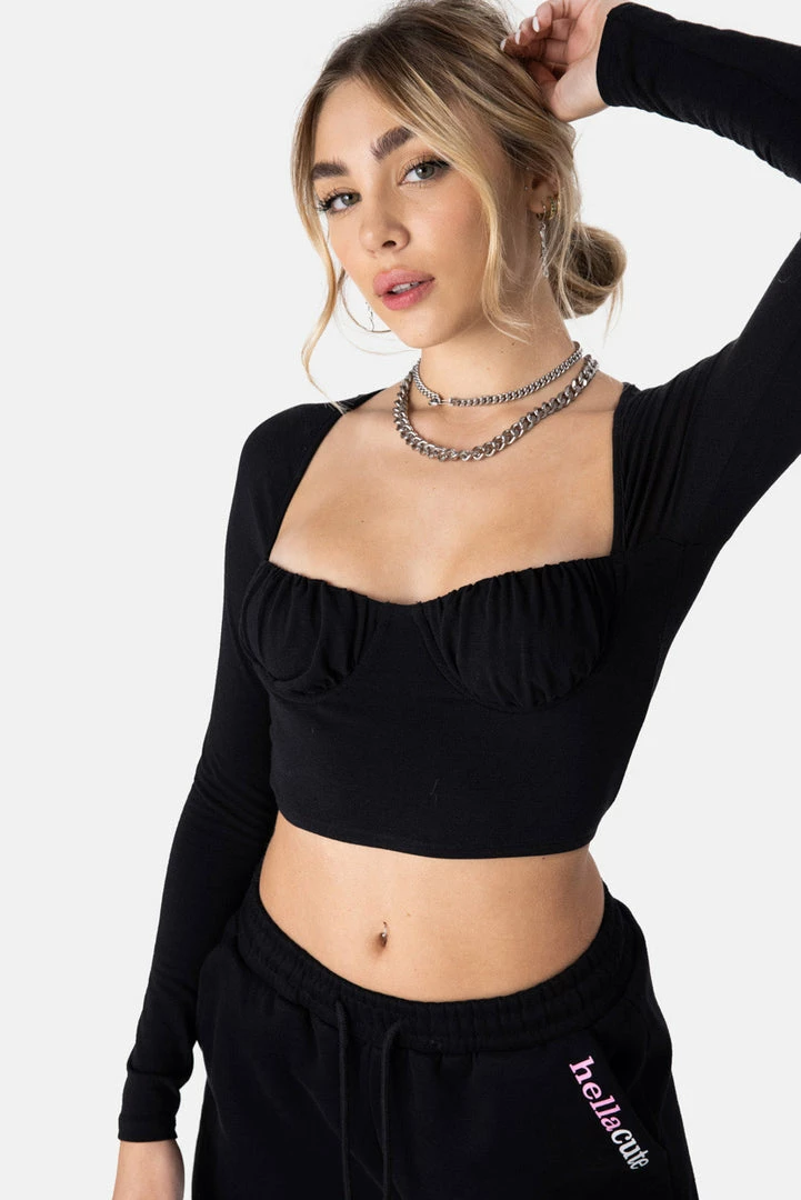 - We all need the kind of support this top has! Super cropped top in stretchy fabric with long sleeves, square neckline, ruched cup detail in the front with corset bones for extra support and an elasticized waistband