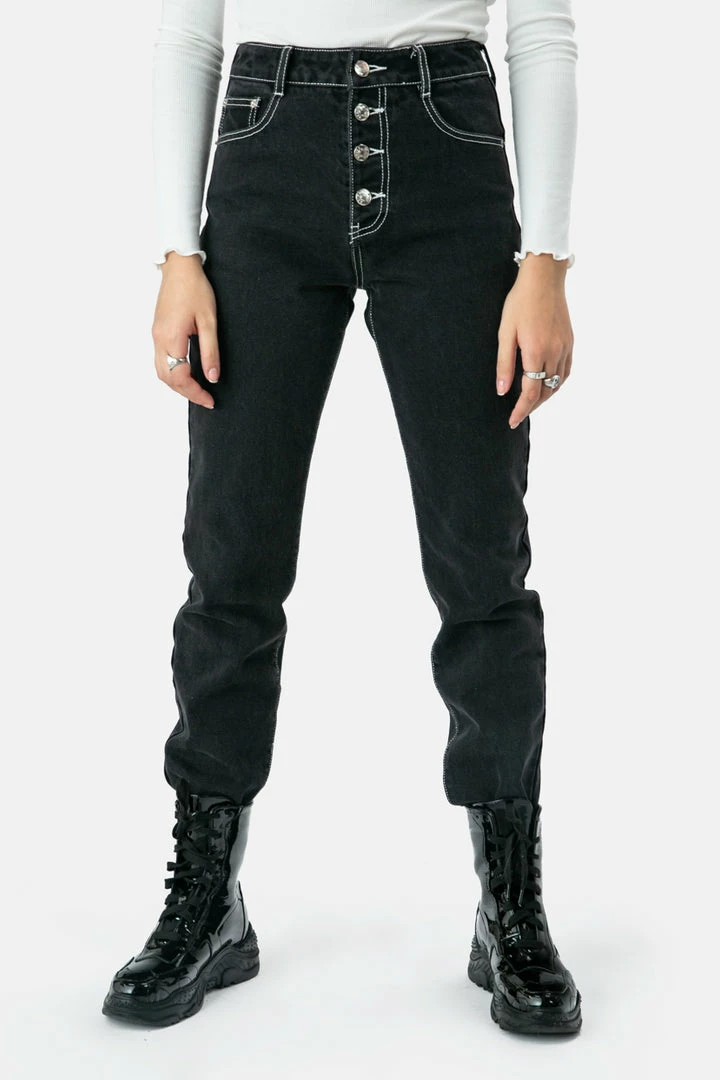 - Straight leg jeans in a light wash featuring button fly and contrast stitching
