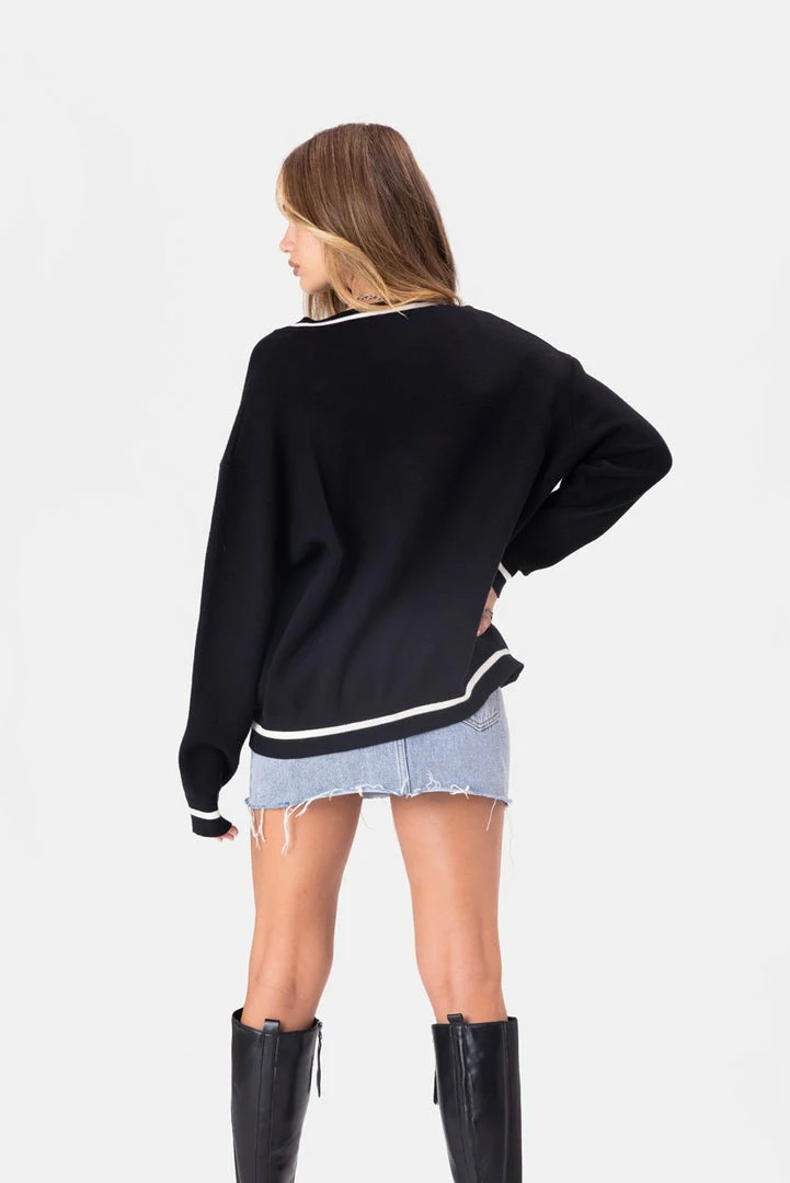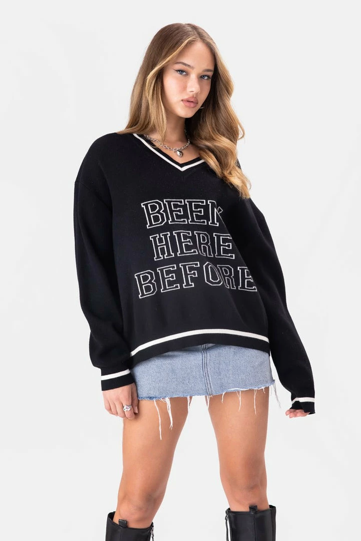- Been here before, happy to be back. Relaxed knit sweater with a v neck, woven-in graphic print in the front and stripe detailing at the outline, plus semi-fitted cuffs.