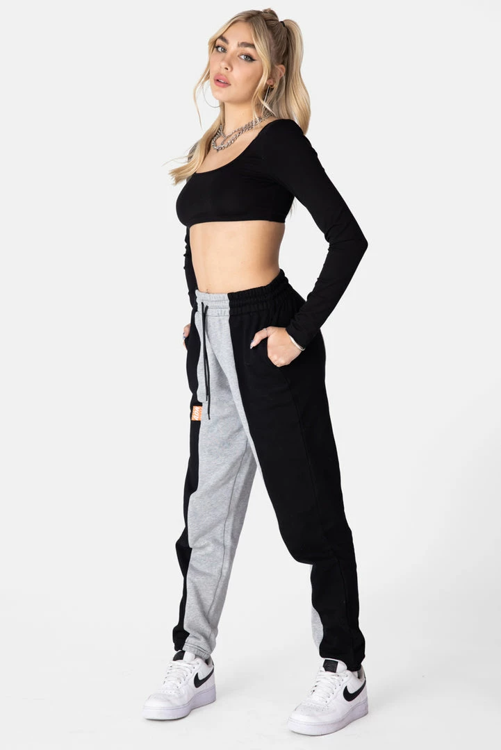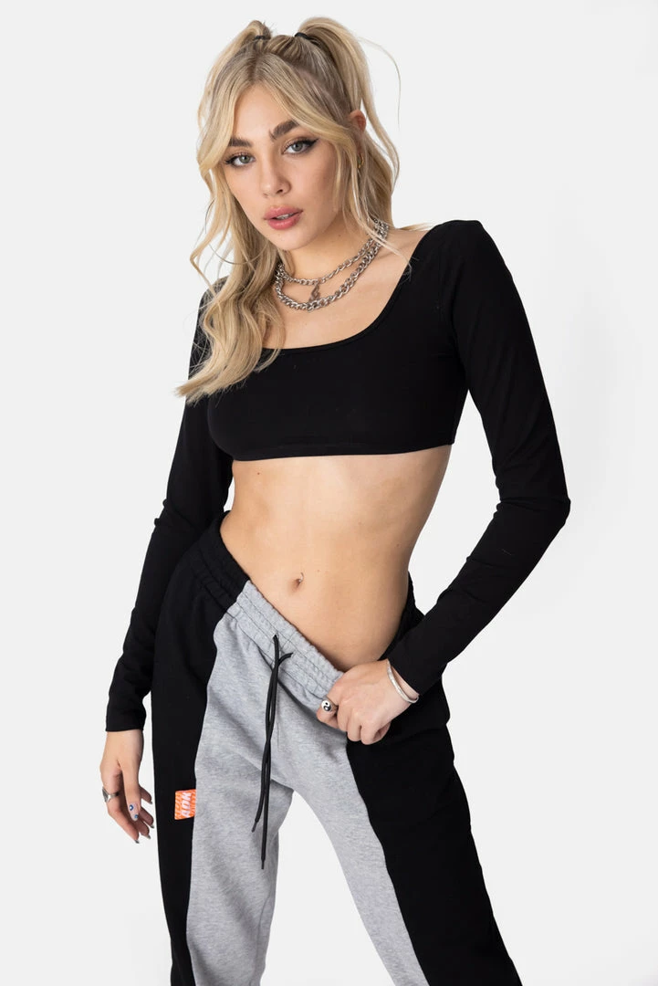 - At the top of your game. Mega cropped top featuring a scoop neck, long sleeves, and a low back with a hook and eye closure.