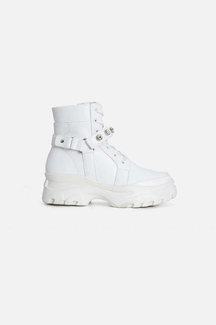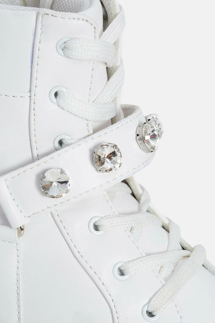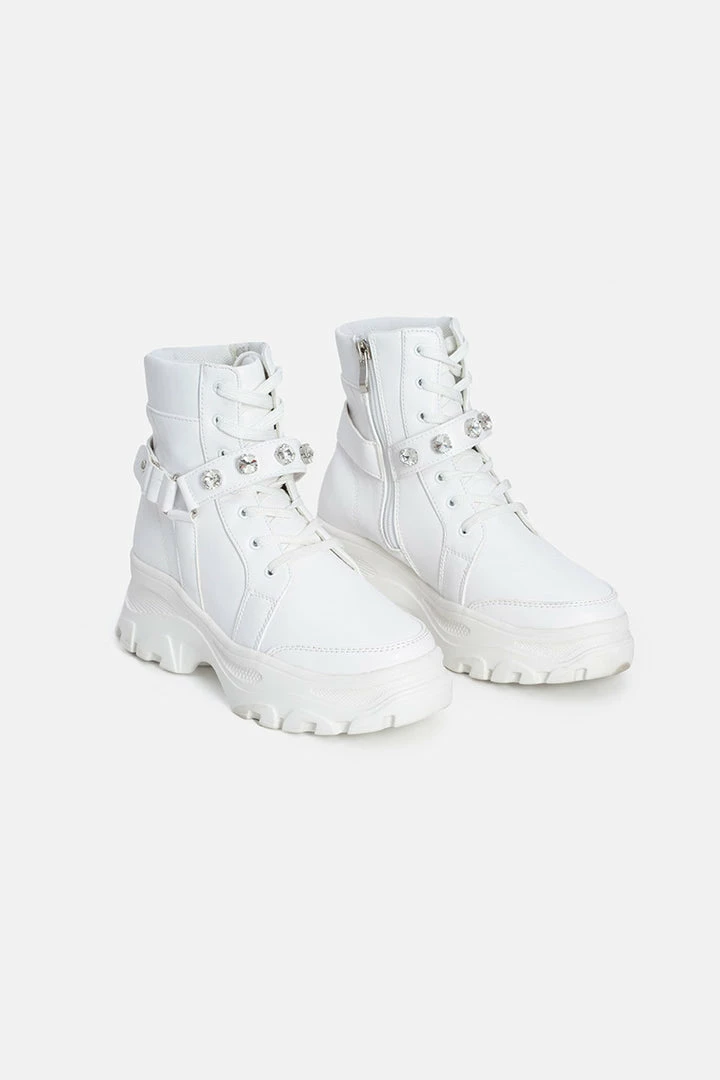 - Always leading the way. These hi-top sneakers come in faux leather with lace-up and an inside zip closure. Including a round toe, chunky platform sole and an embellished ankle strap and inner mesh.
