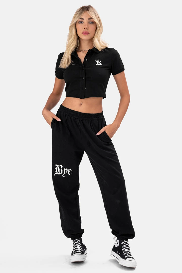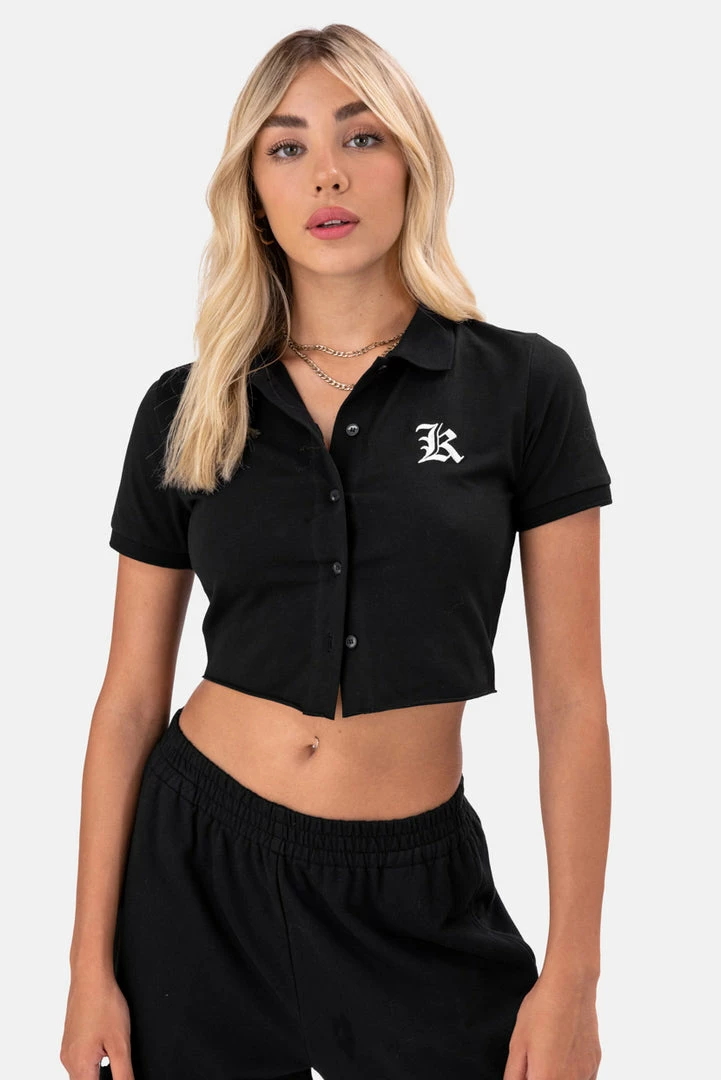 - K, this top is just perfect, bye. Stretchy polo style cropped top with a classic collar, button-up closure, embroidery in the front and raw-cut hem.