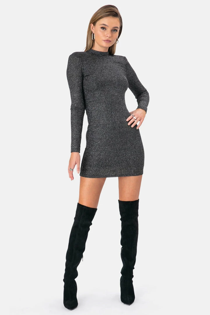 - Long sleeve mini dress featuring colorful shiny finish, mock neck and exposed back