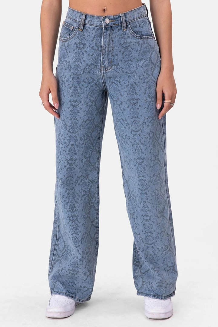 - Snake charmer, but make it swag. Wide-leg jeans in high-waisted fit with washed snake pattern all-over and belt loops. Including a button and zip closure, front round pockets and back patch pockets.