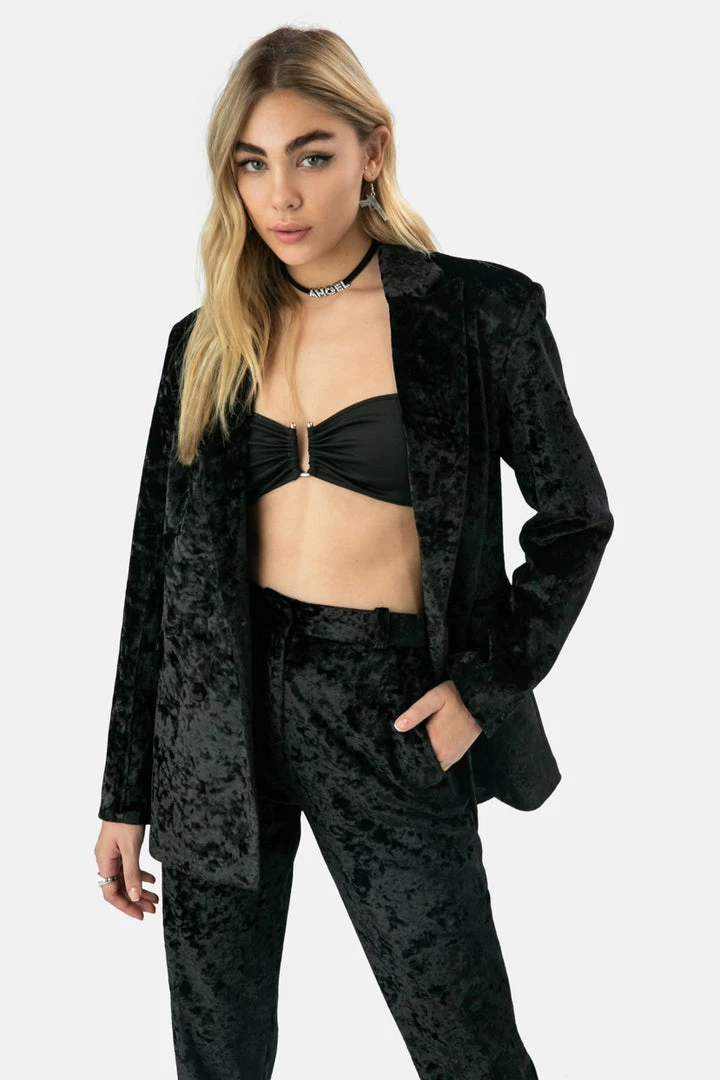 - Business, but make it fashion. Super chic blazer in a soft, velvety feel featuring notch lapel and button closure