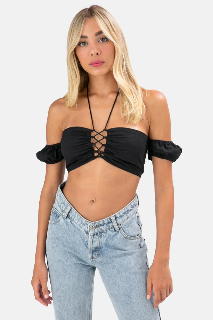 - Is it vacay o’clock yet? Super cropped off-shoulder top with perfect puff sleeves and tie strings in the front. You know what, it doesn’t matter, you need this.