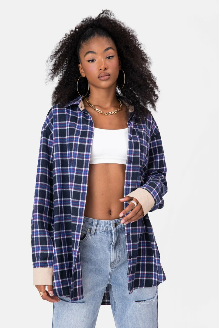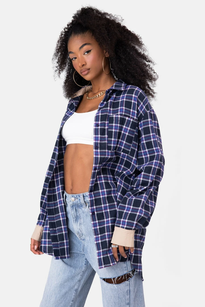 - Don’t be square. Oversized flannel shirt in all-over plaid print with button closure, classic collar, chest pocket and long sleeves with color-block button cuffs.