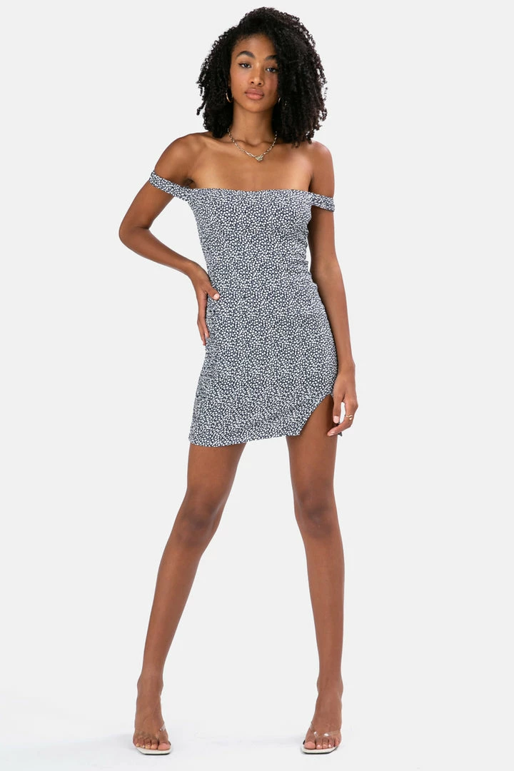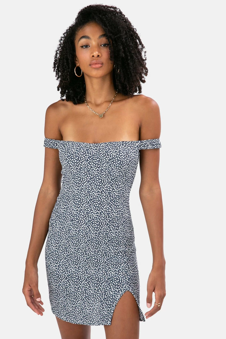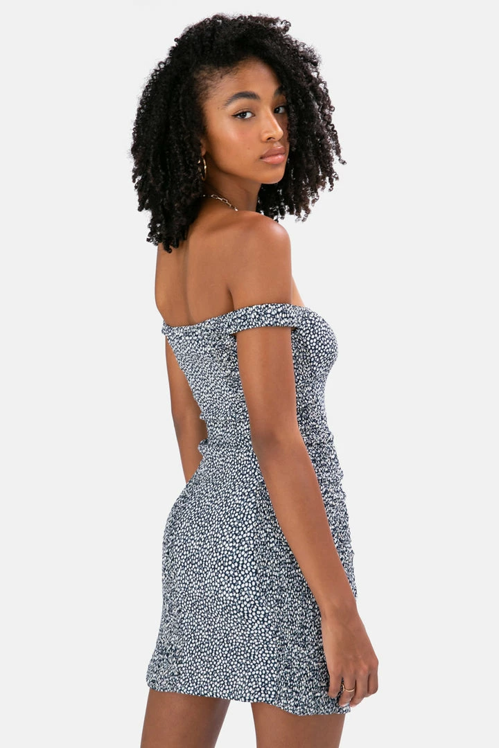 - Take the vacay vibes with you! This off-shoulder mini dress in an all-over daisy print comes ruched at the top and the chest, with small side slits and an inner lining.