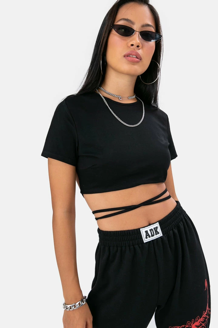 - Business in the front, party in the back! Cropped tee with long tie strings that you can wear anyway you choose, and exposed back for extra style.