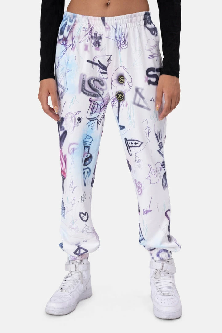 - Spray the word! Relaxed sweatpants made in a super soft and warm jersey, with graffiti-style graphic print all-over, side pockets and fitted cuffs. The drip is real.