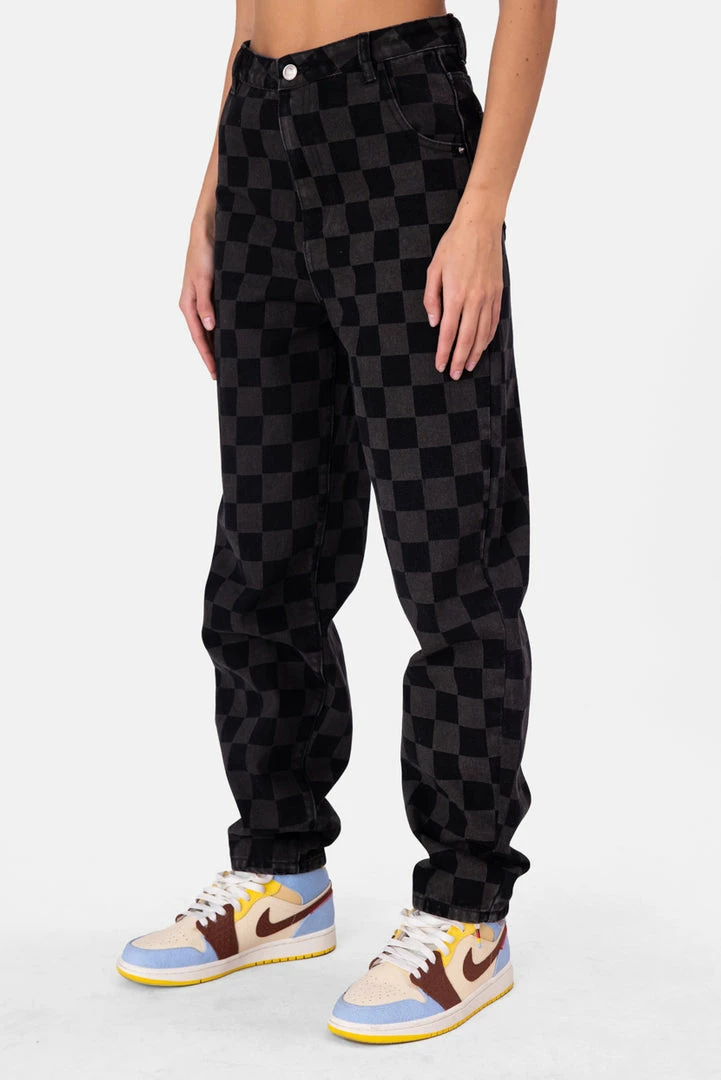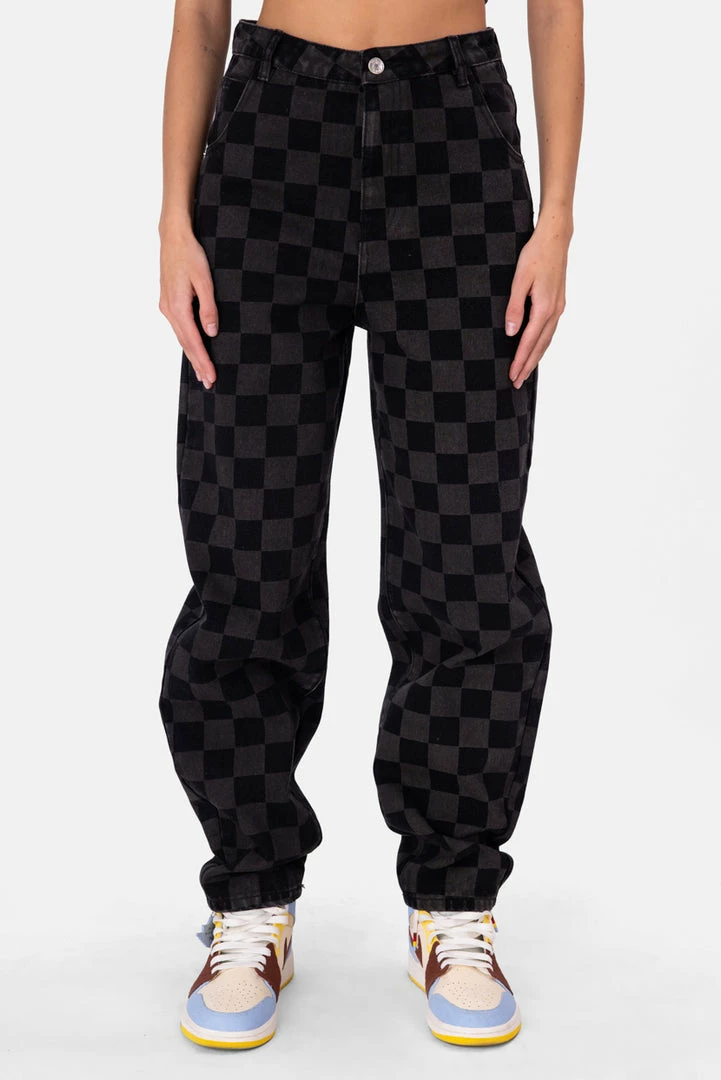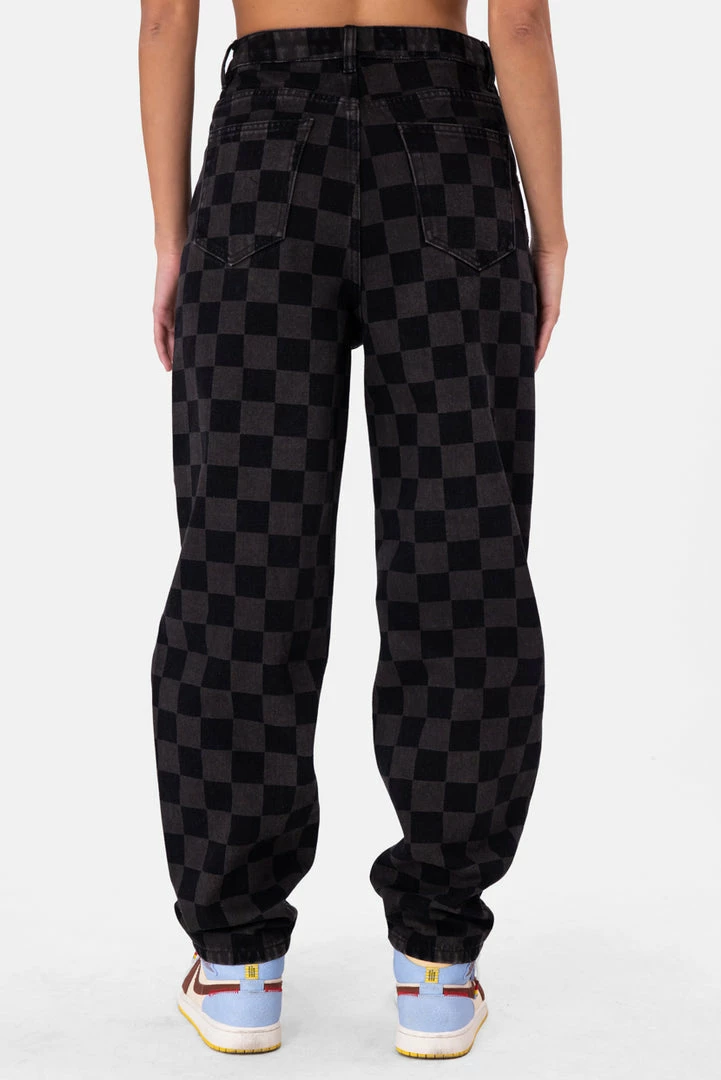 - Check on it. High waisted, oversized jeans in a checkers print all over with dropped crotch, button and zip closure, belt loops and a 5 pocket design. Swag.