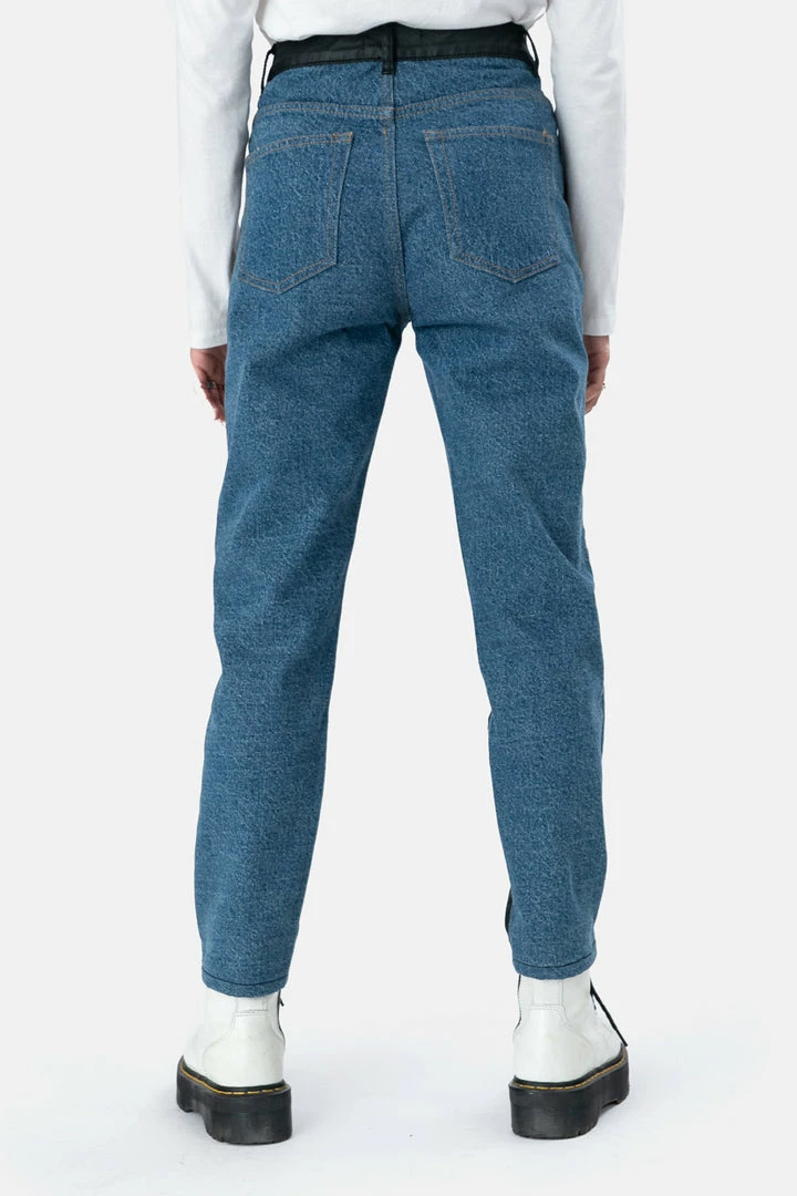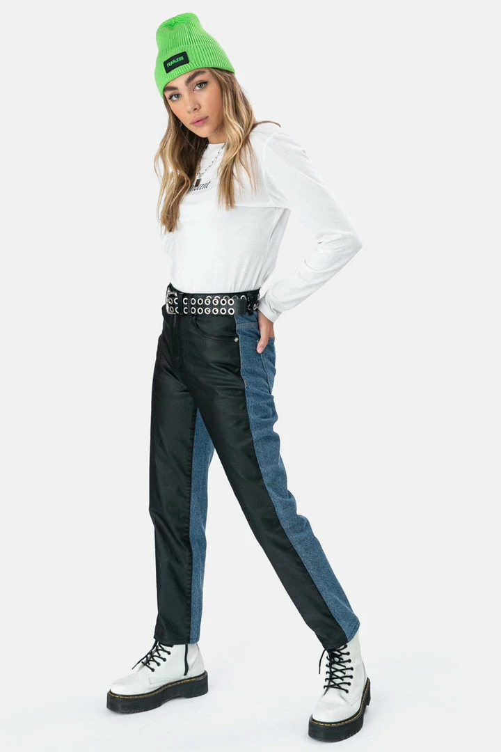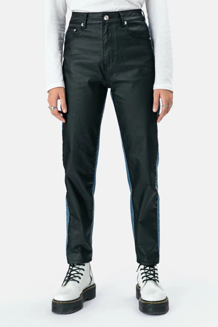 - Straight leg jeans in a high waisted fit featuring an awesome faux leather contrast in front