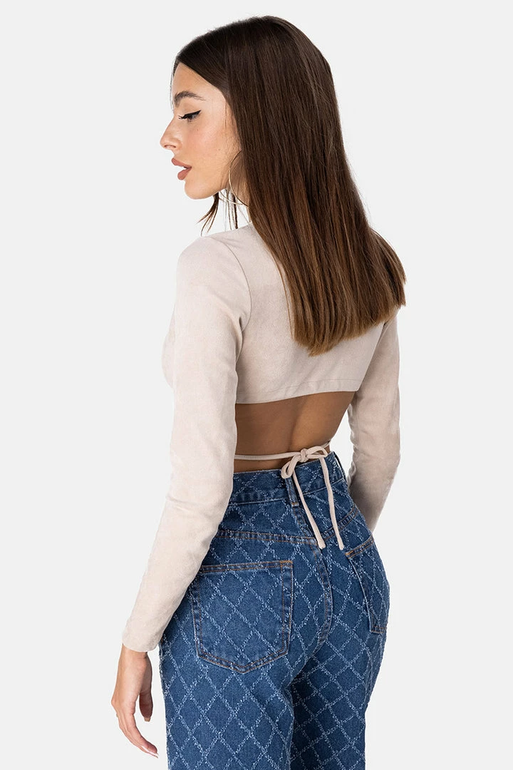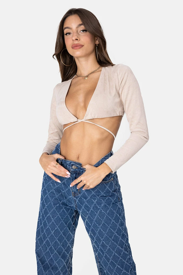 - Drape me in this, tnx. Mega-short wrap top with long sleeves, a deep V-neck and adjustable tie strings.