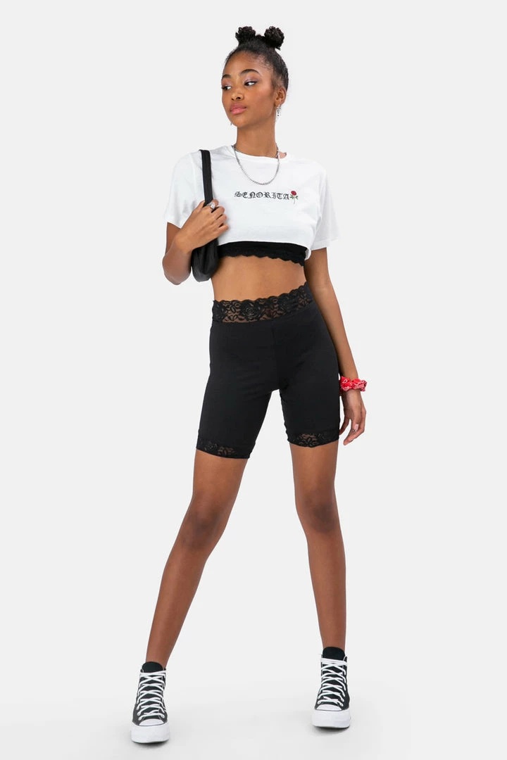 - New kinda basic: your super classic biker shorts made extra classy with lace trim. Yes, honey!