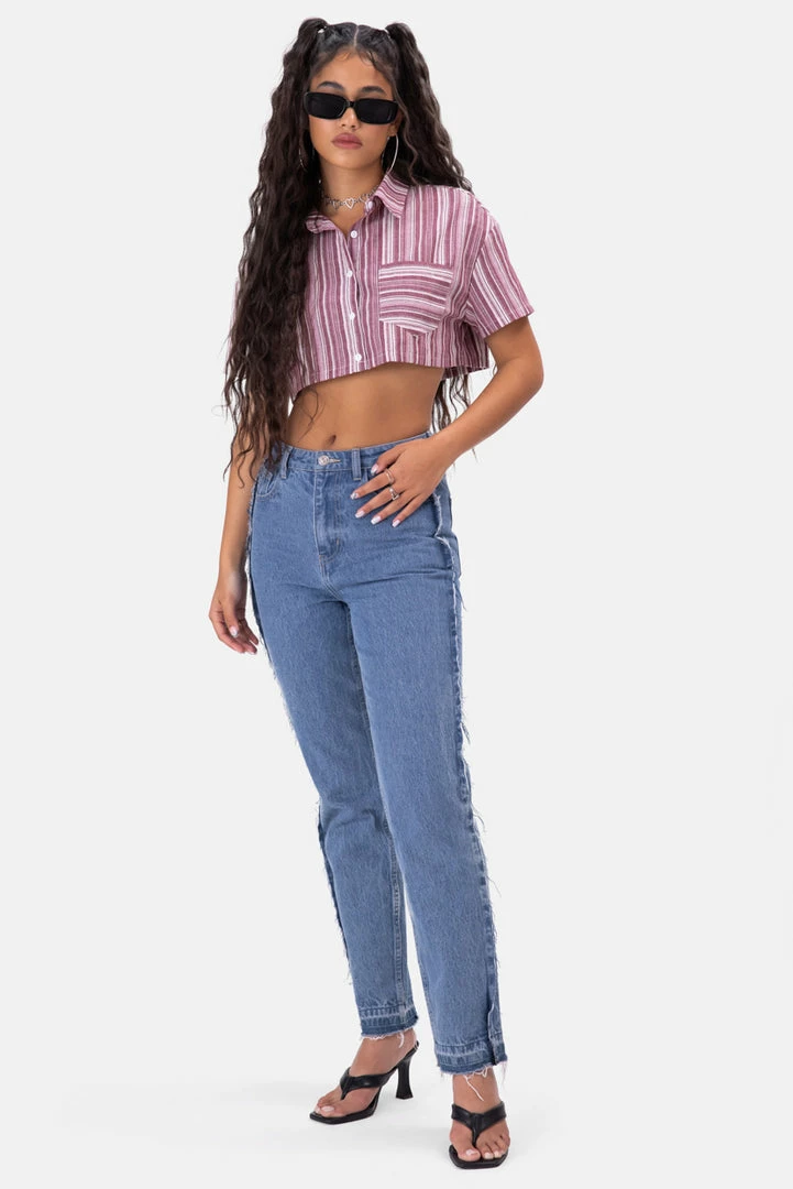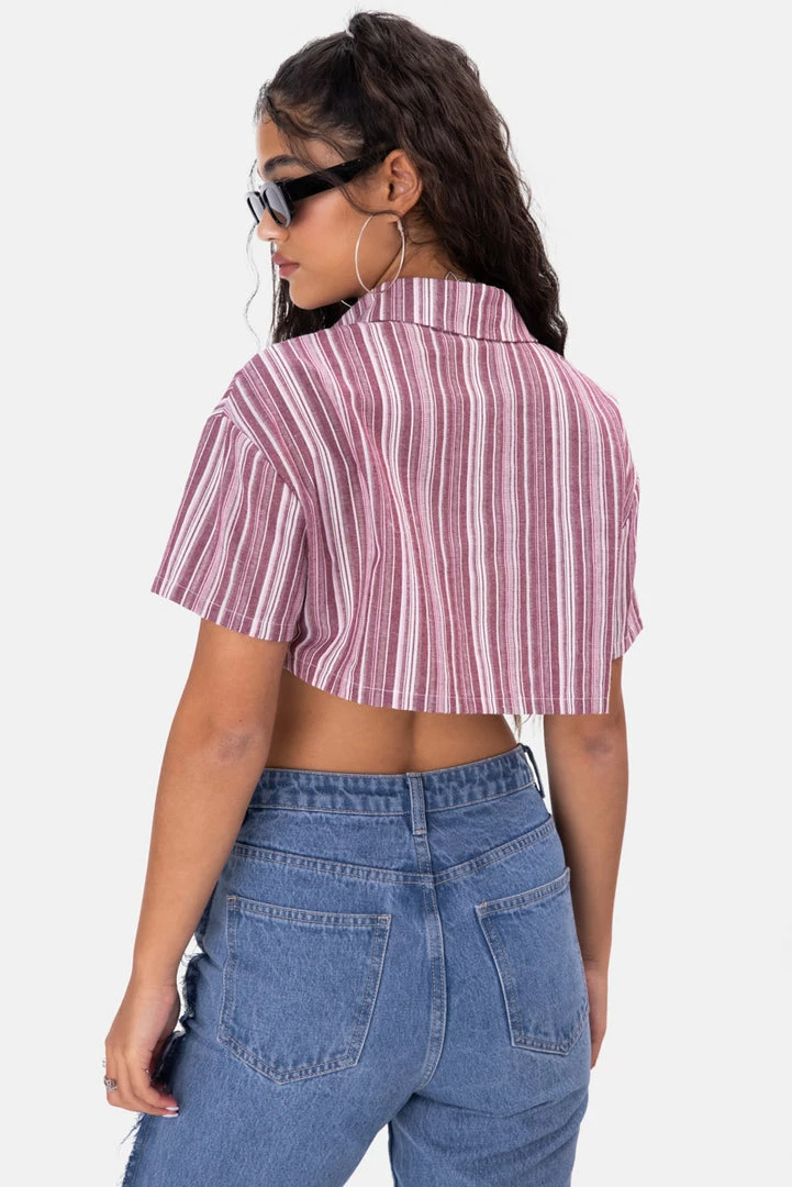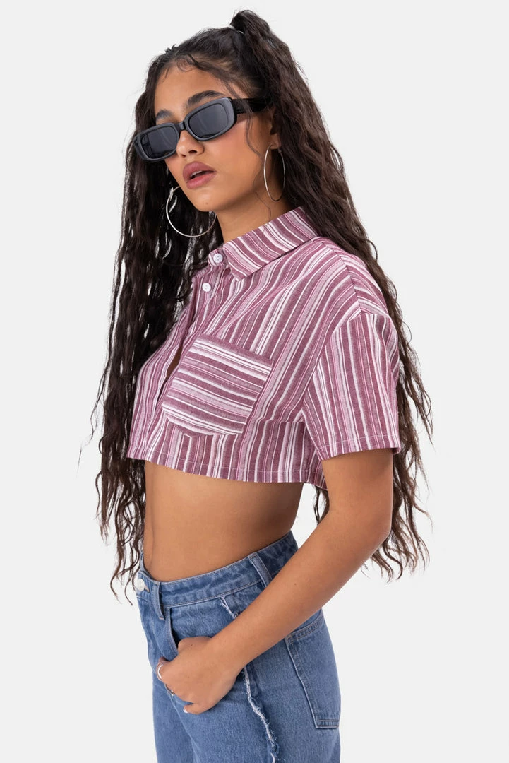- Too cool for school. This cropped shirt comes in an all-over striped print weaved fabric and a relaxed fit. Featuring a classic collar, button closure, chest patch pocket, dropped shoulder line and short sleeves.