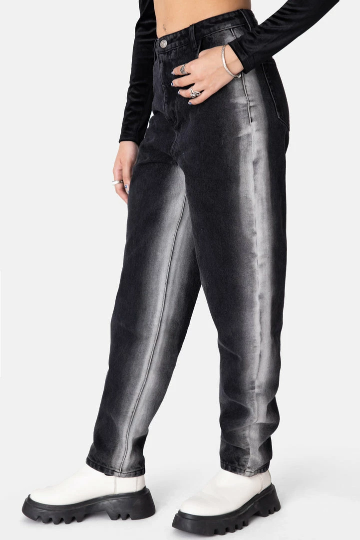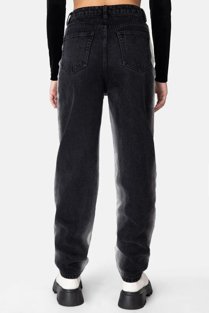 - Throwin’ just a wee-bit of shade. High waisted, balloon fit jeans with bleached side seams, button and zip closure, belt loops, front round pockets and back patch pockets.