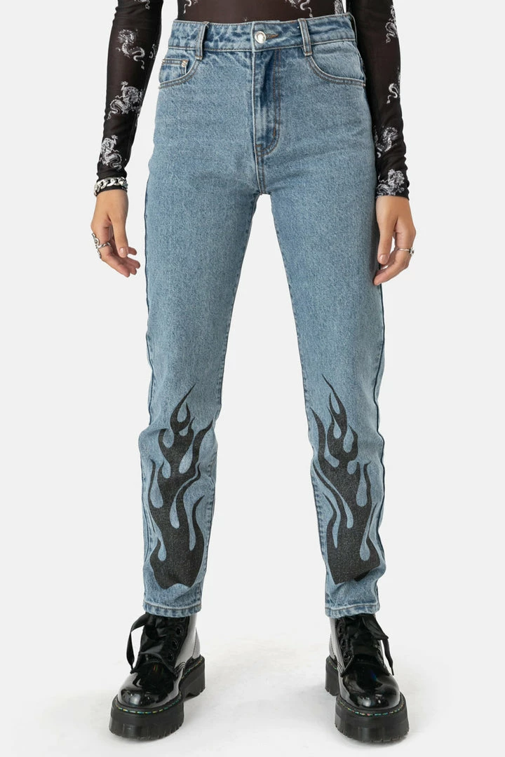 - Super lit MOM Jeans featuring black flame print in high-rise fit