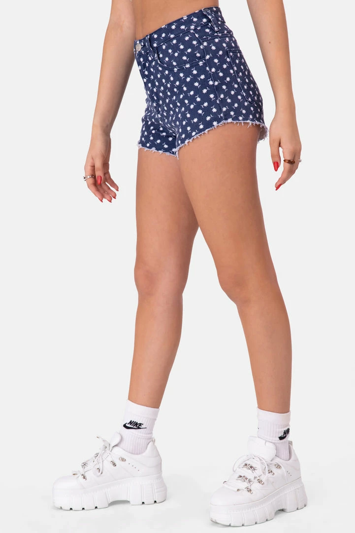 - Youโre my best bud. Super short denim shorts in a natural waist rise with flower print all-over, button and zip closure, belt loops, 5 pocket design and a fringed hem.