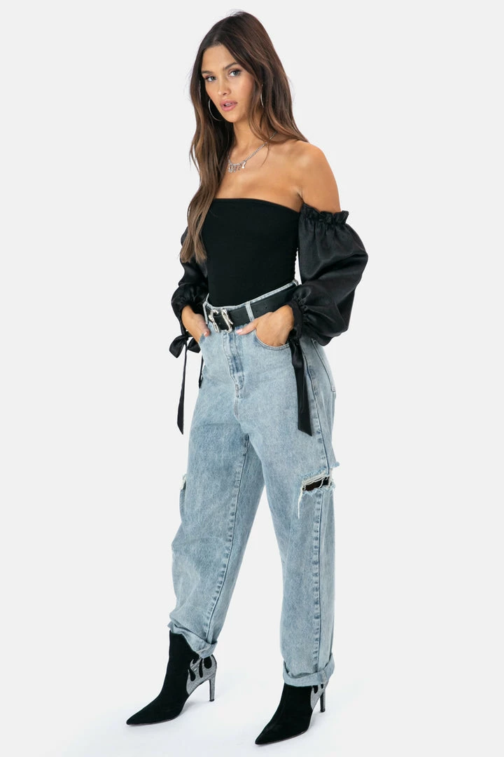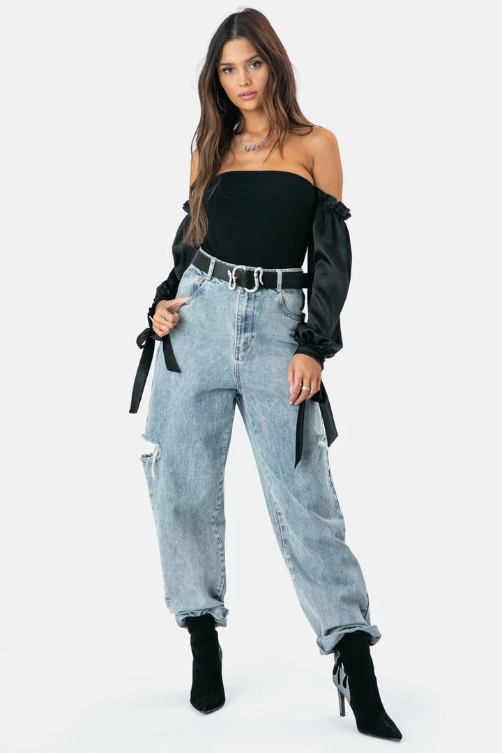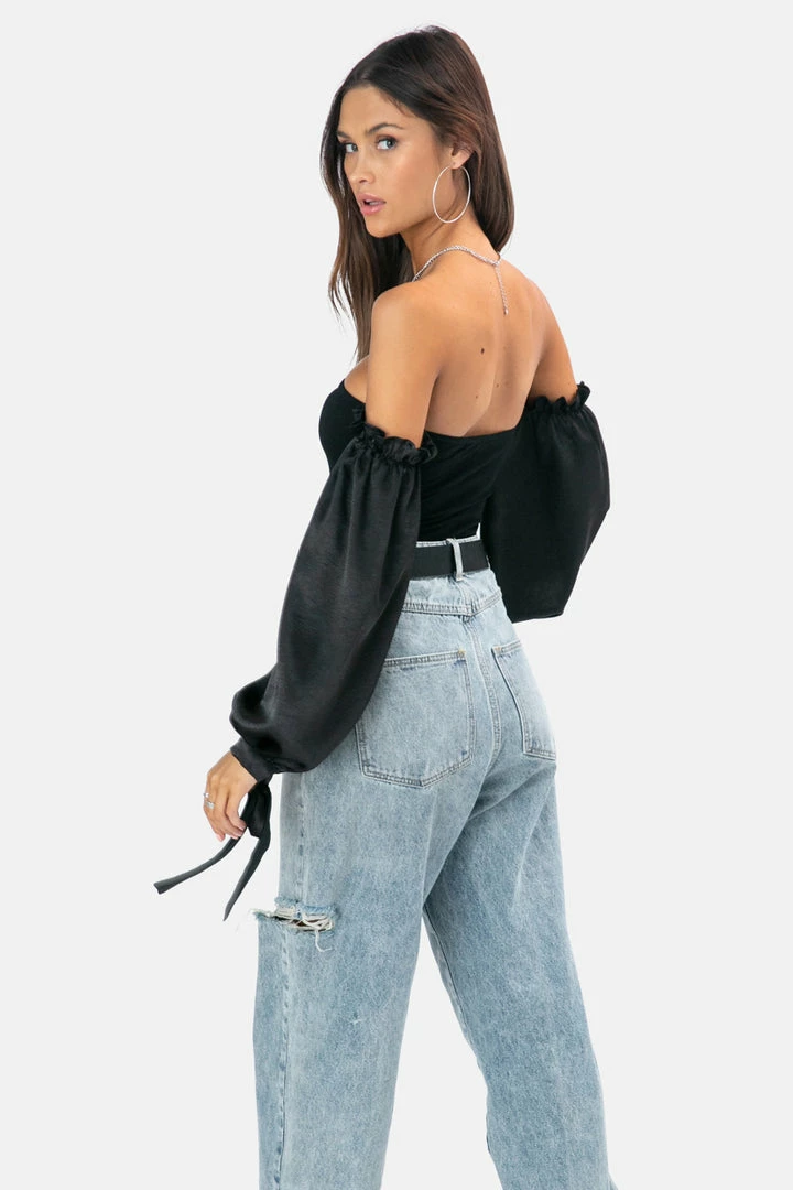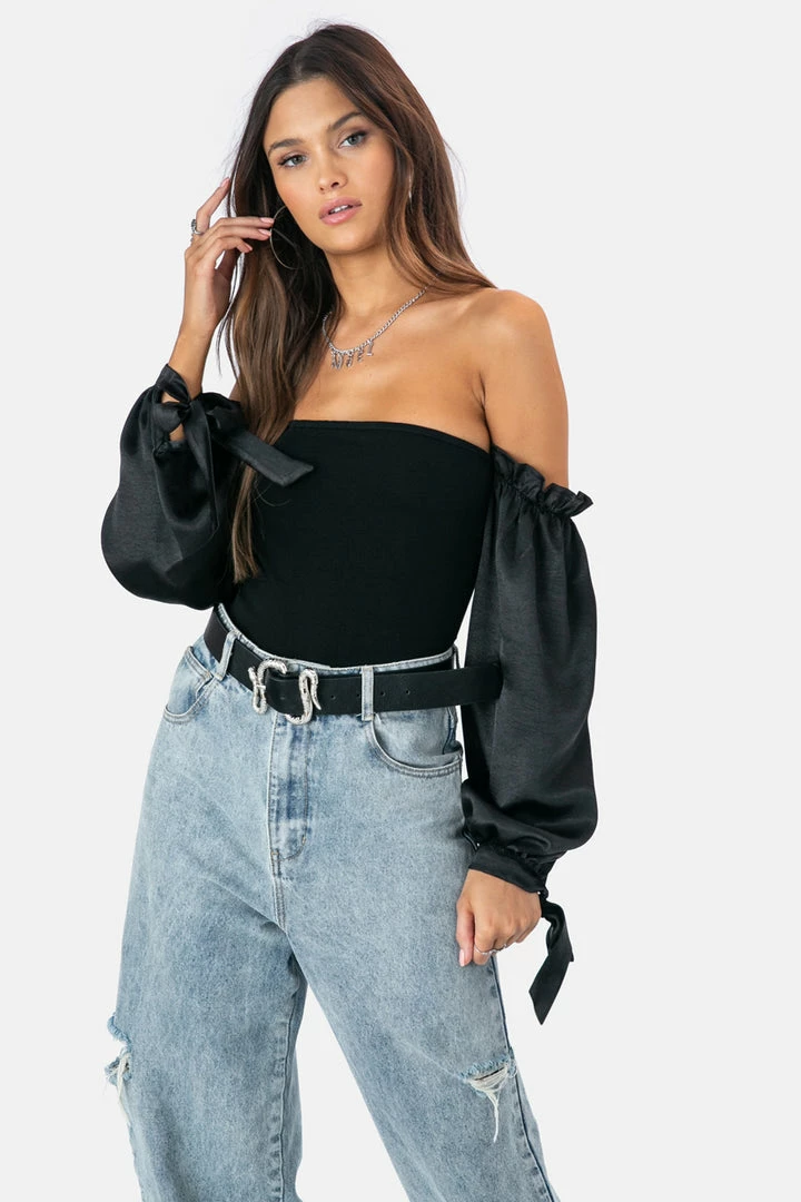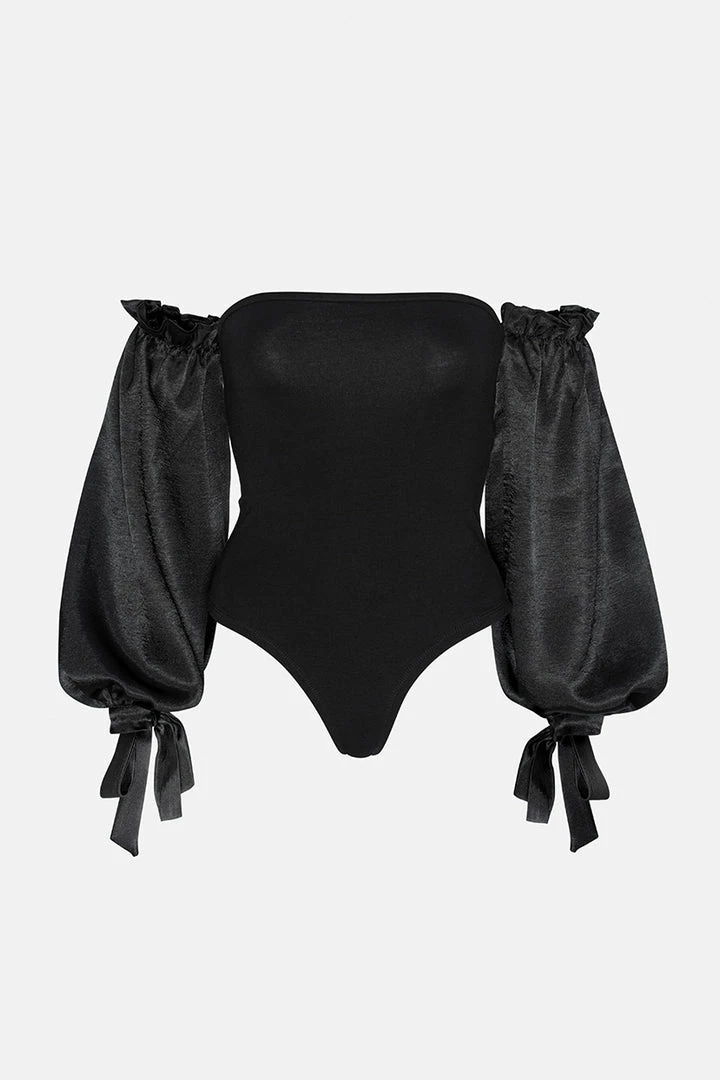 - Off shoulders bodysuit featuring balloon sleeves in satin finish with frill and tie-string detailing