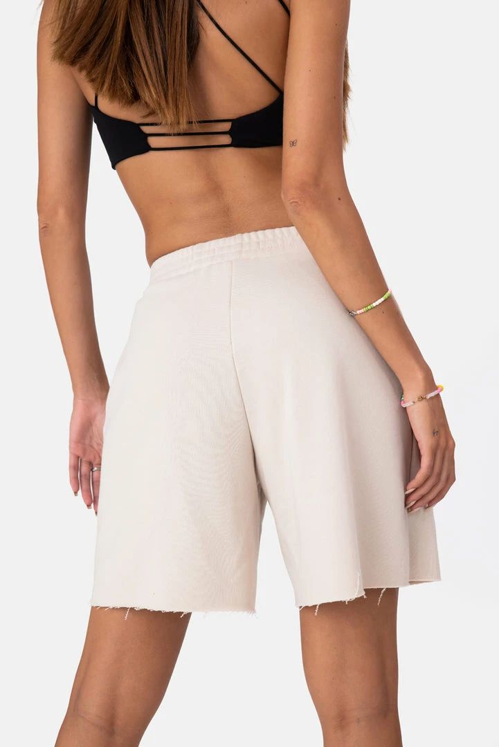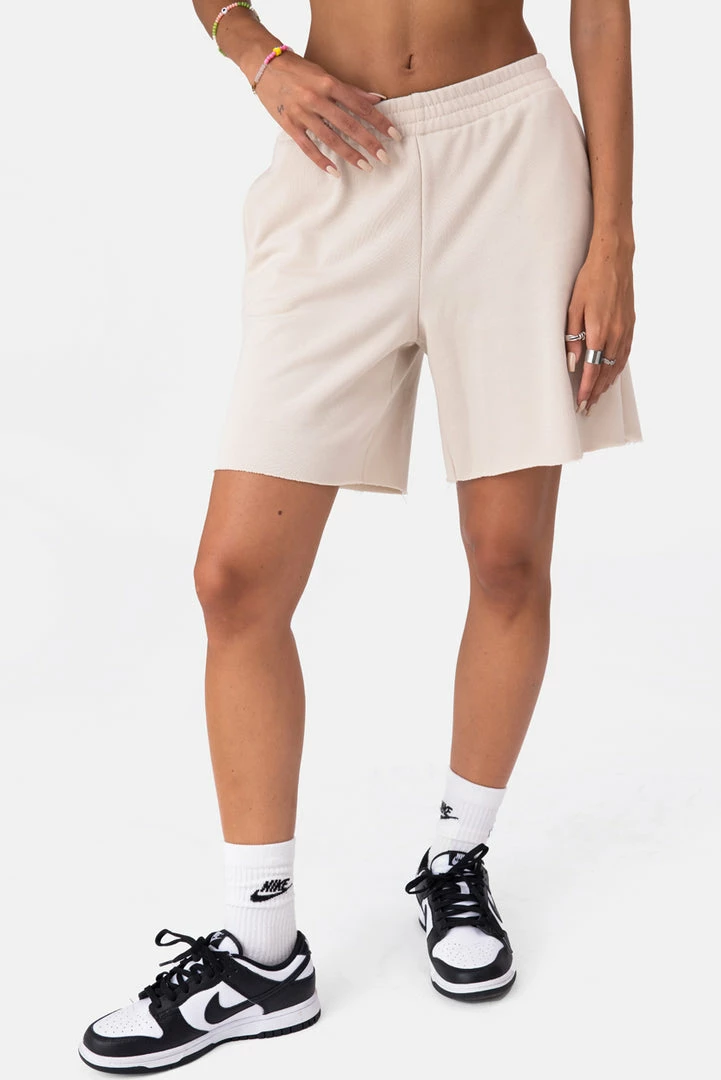 - Donโt sweat it. Super-comfy sweat shorts in an above-the-knee fit with an elastic waistband, front welt pockets and raw-cut hem.