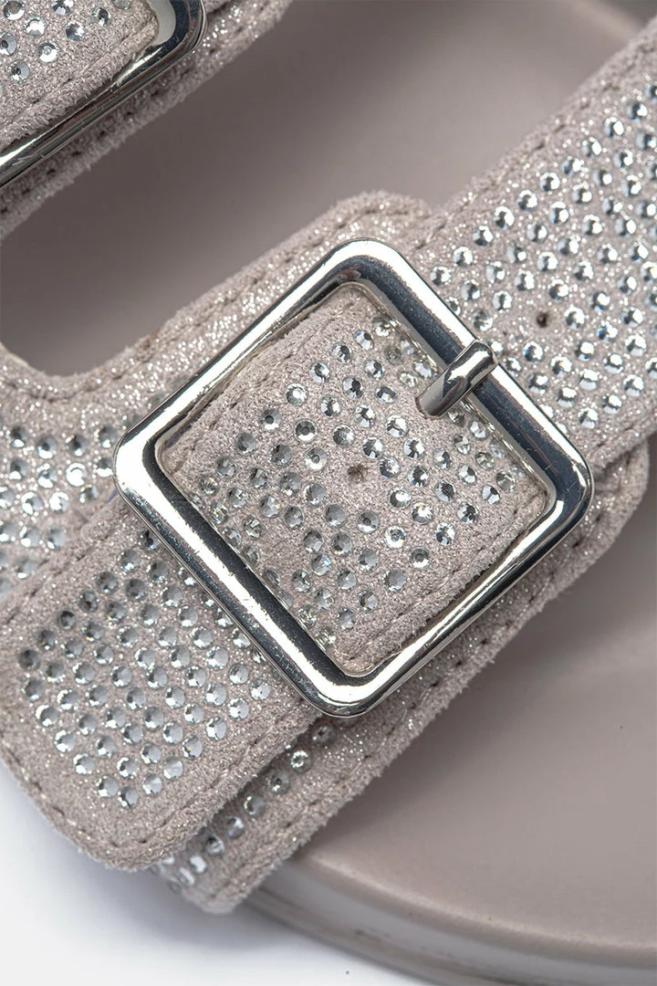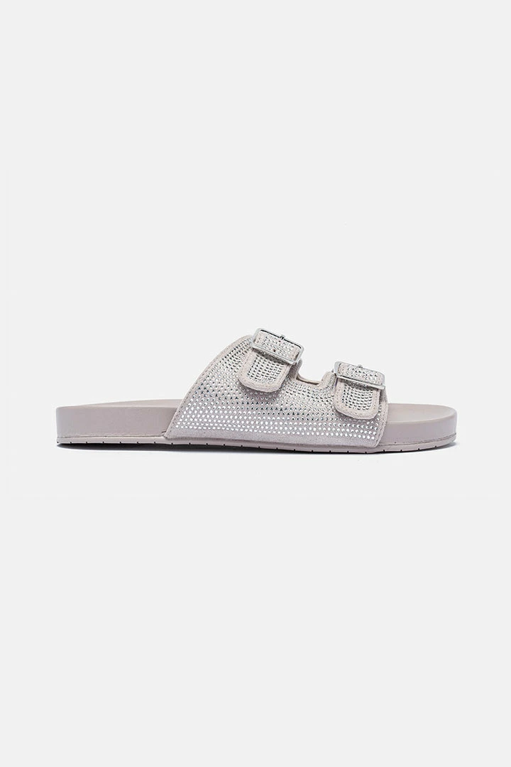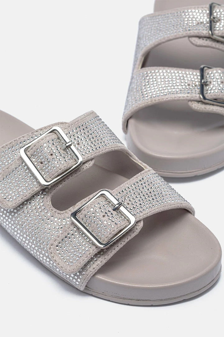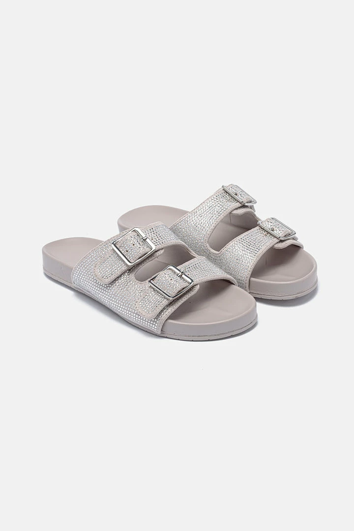 - Glam is always in fashion, which is why you totally need these! Slip-on sandals featuring two straps with rhinestones, buckle closure and super-comfy sole.