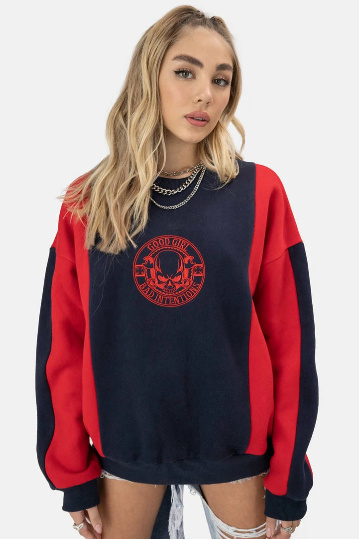 - Welcome to our βgood girl, bad intentionsβ club! Color-block design sweatshirt in an oversize sweatshirt with super-fun embroidery in the front and a ribbed outline. Youβre so in.