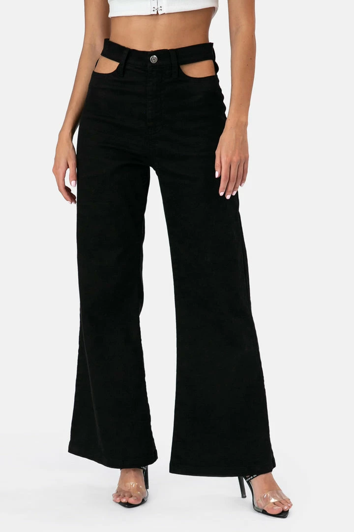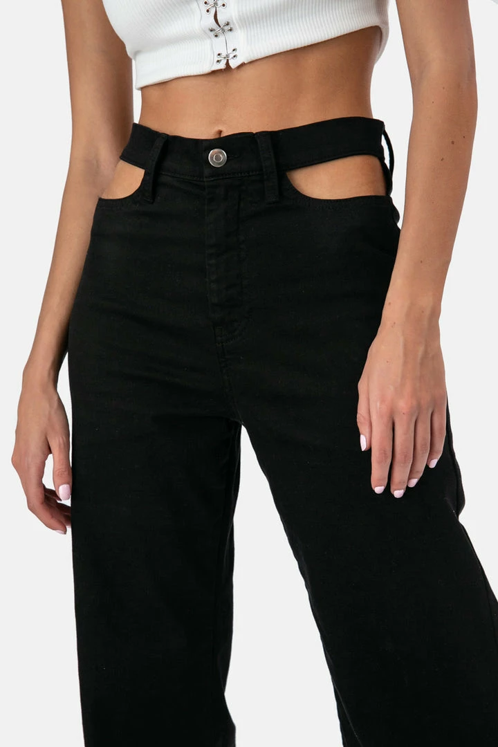 - CUT TO THE CHASE! Wide leg jeans in a high waisted fit, with sick cut-out detail at the waist. Get groovy, babe.