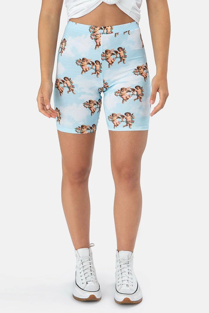 - Ain’t no angel: mid-thigh biker shorts with all-over angel print, with a banded waist for the comfiest wear.