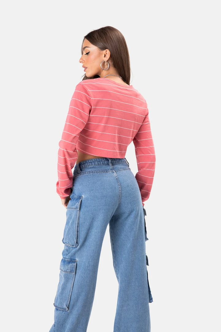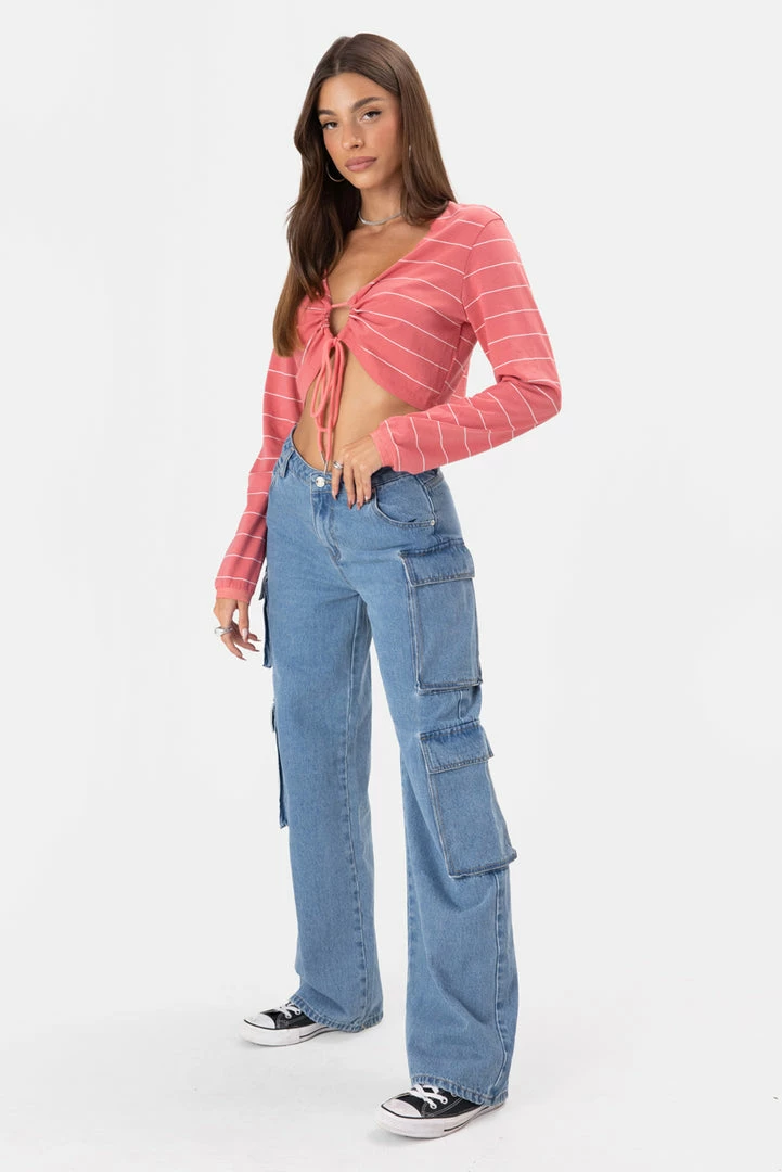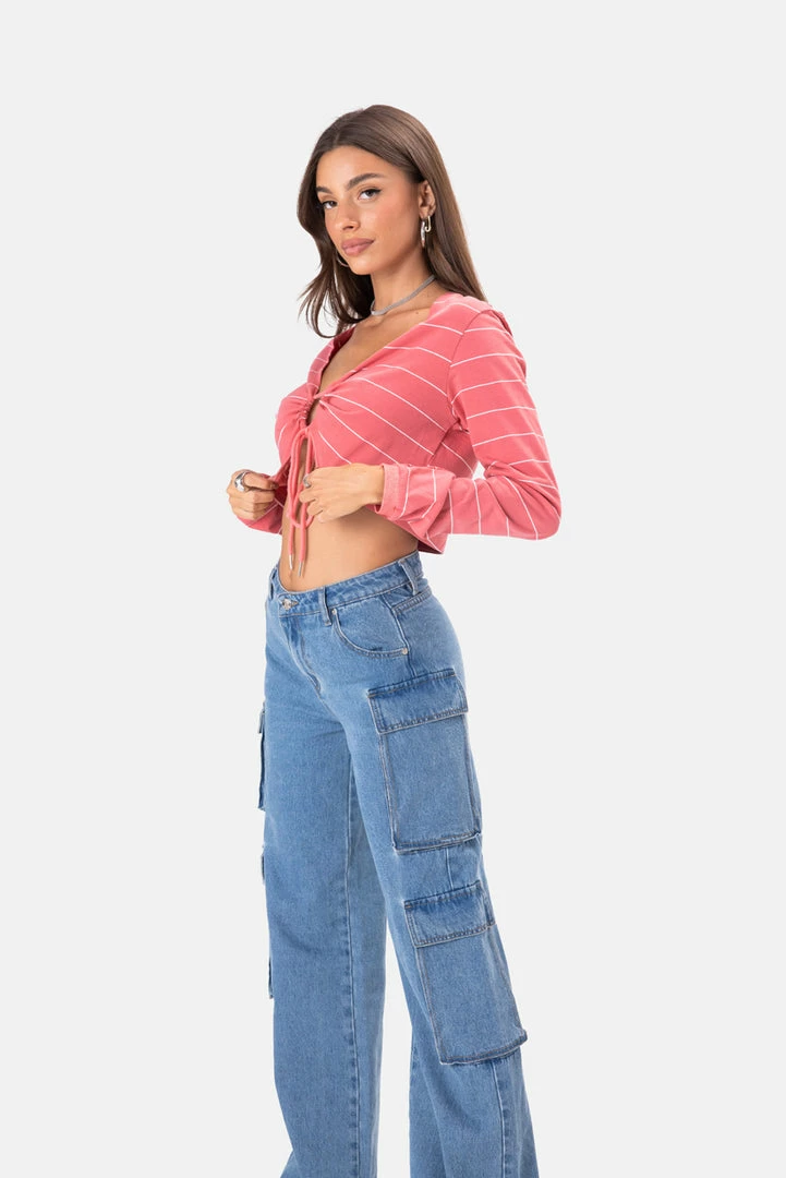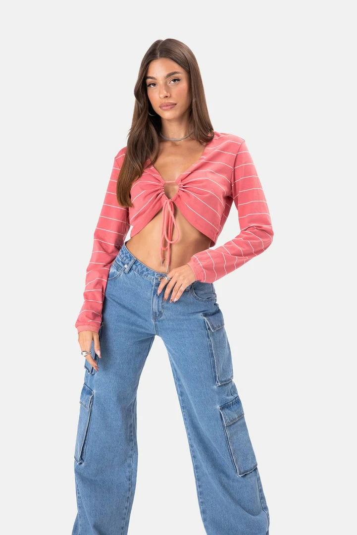 - Get in line. Cropped top in all-over stripe print with long sleeves, deep V neck and ruched center front with adjustable pull strings.