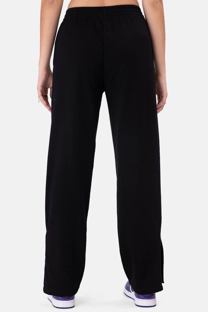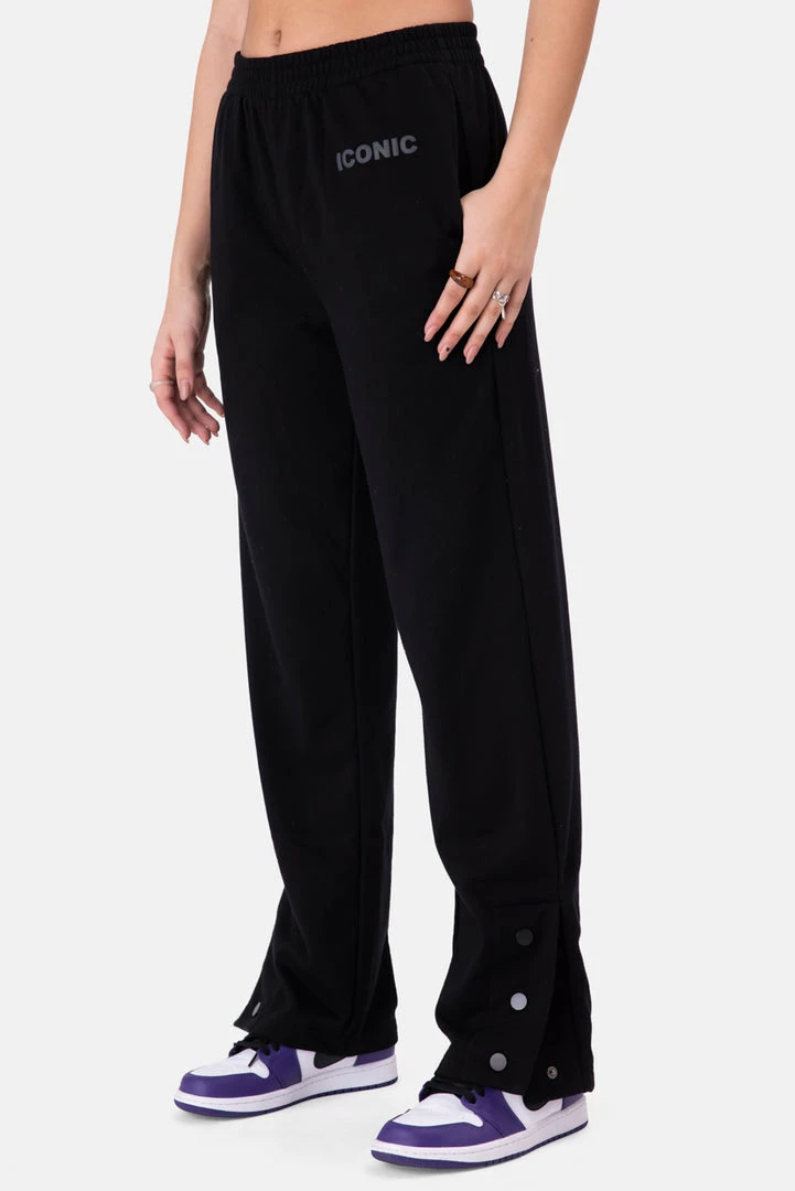 - Oh, snap. Wide fit sweatpants with graphic print detail on the front, an elastic waistband, front inseam pockets and snap-button hem details.