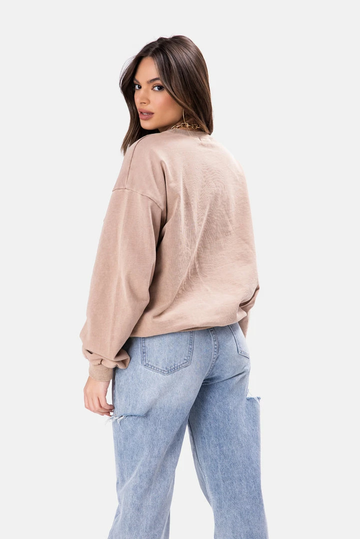- Tell ‘em to wash out. Oversized, washed sweatshirt with typographic print on the front, crew neckline, dropped shoulder line and ribbed outline.