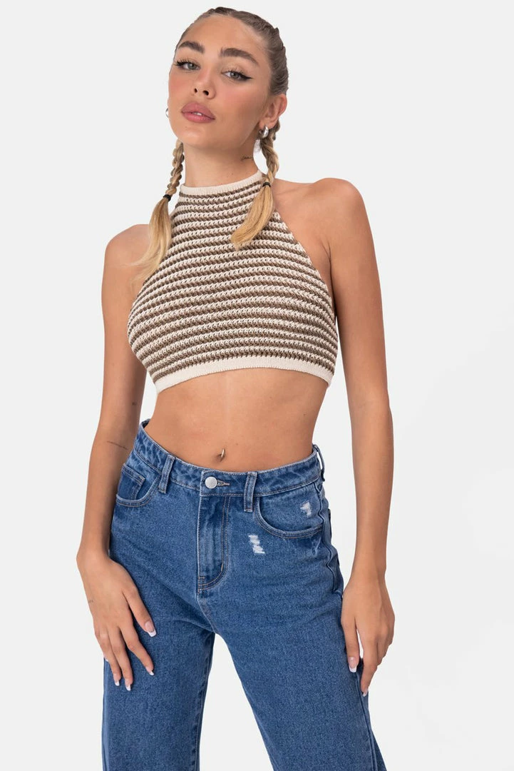- In line with it. Knitted halter crop top in stripe pattern all-over with ribbed outline and tie closures in the neck and open back.