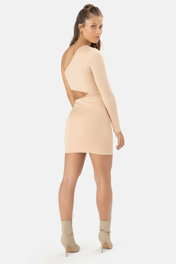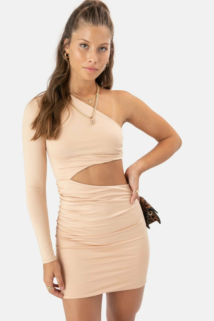 - One-shoulder mini dress featuring cut-out and light ruche detailing
