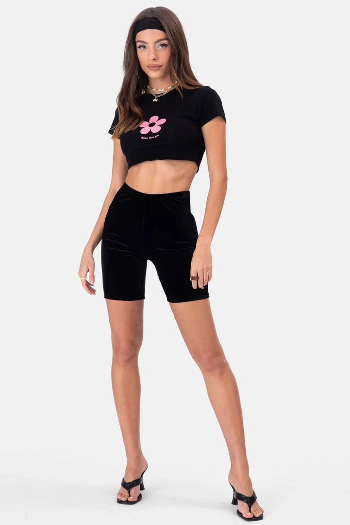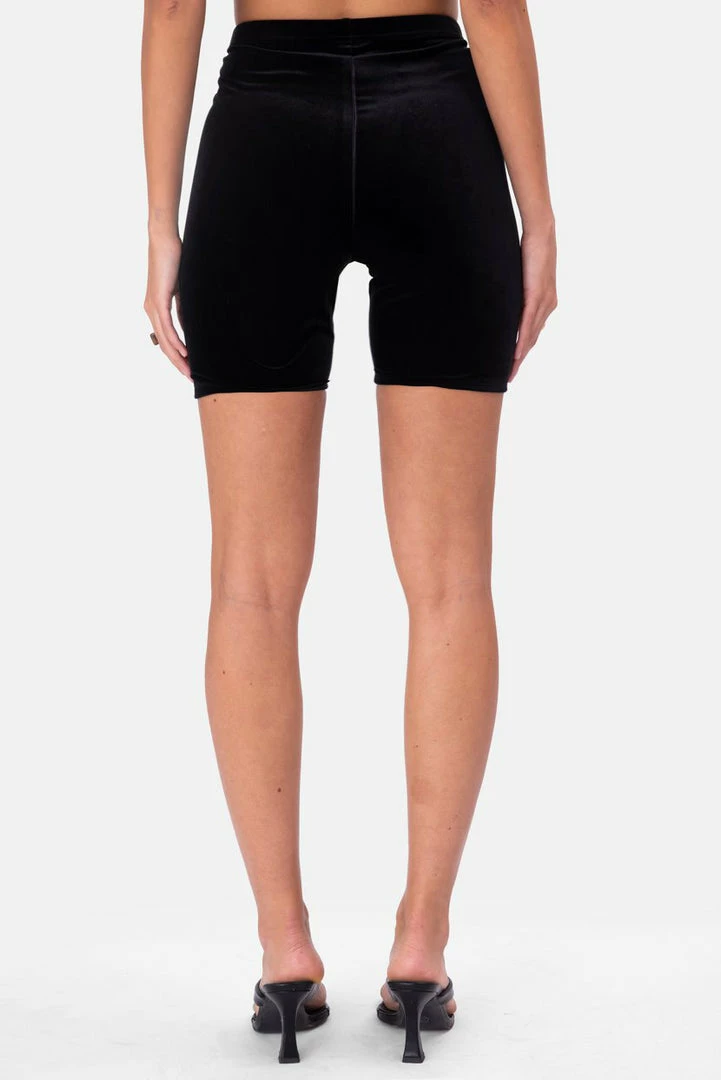 - Now, that’s a smooth move. Velvet biker shorts in an above-the-knee length with an elastic waistband.
