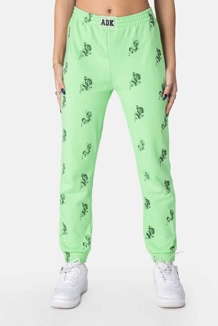 - Crushing on these green sweatpants featuring banded waist with ADK logo, fitted cuffs and allover dragon print