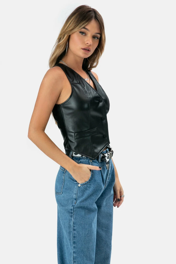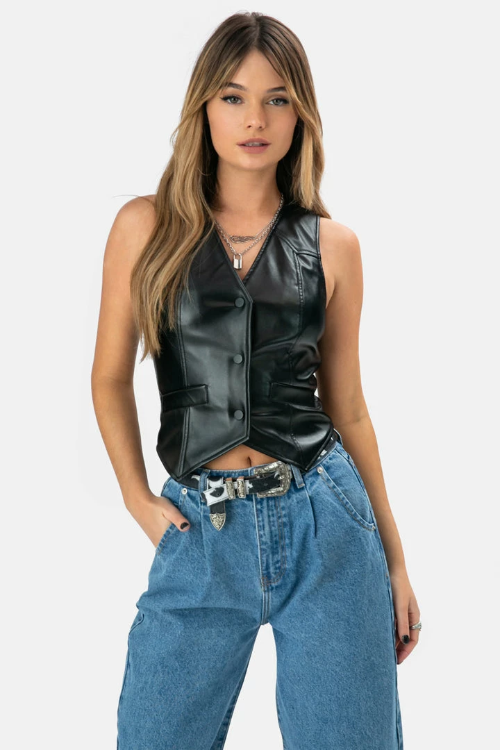 - Faux leather vest featuring V-neck and snap button closure