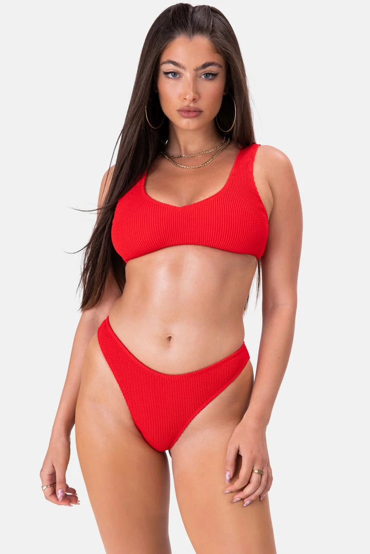 - Straight fire. Brazilian fit textured bikini bottom with a high leg cut and an inner lining.