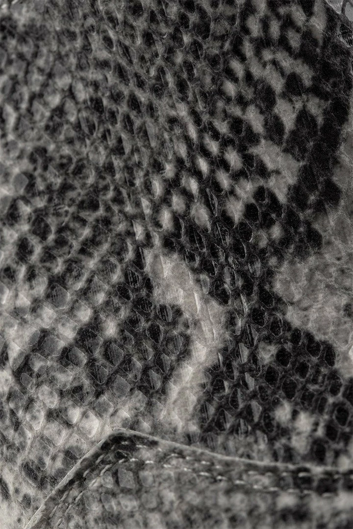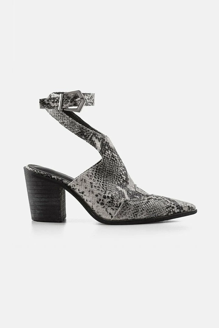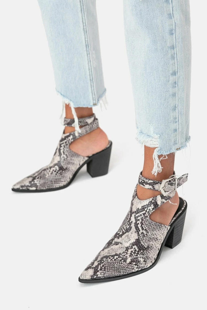 - Pointed-toe snake mules with ankle-strap closure and chunky heel