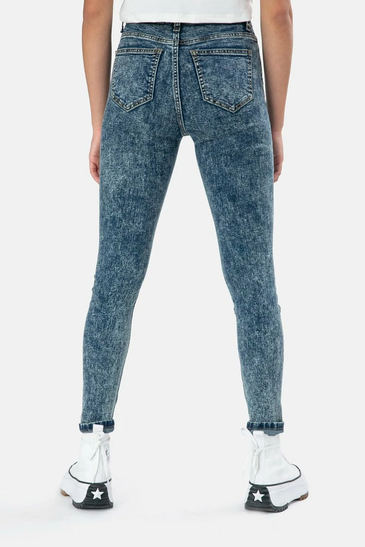 - Girl you must be trippin’. High waisted skinny jeans in a sick acid wash featuring distressed detailing at the knees, with front zipper and button closure
