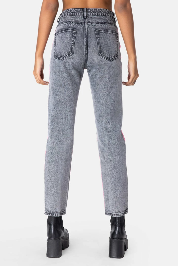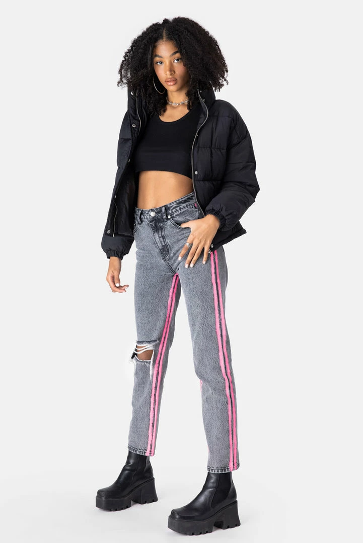 - There you glow, hun. High waisted, washed jeans with neon stripe detailing on the side seams and a distressed detail in the front. Including a cropped hem, button and zip closure, belt loops, front round pockets and back patch pockets.